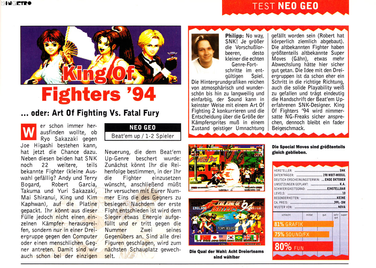 KOF ist ein beispiel dafür wie hochwertig Entwickelt wurde damals (Mittel 90er) und keiner mehr zu Schätzen weiß.Garou: Mark of the Wolves hat man wirklich, aber wirklich alles dem Power rausgeholt im Konsole. KOF bis 98 war noch gut. Bis 99 und des Weitere kam mir auf die Keks. Die Magazinen niedrig Bewertet wurde war nur allen wegen des schlechten Portierung zu PSOne usw. Dann könnte man es verstehen.