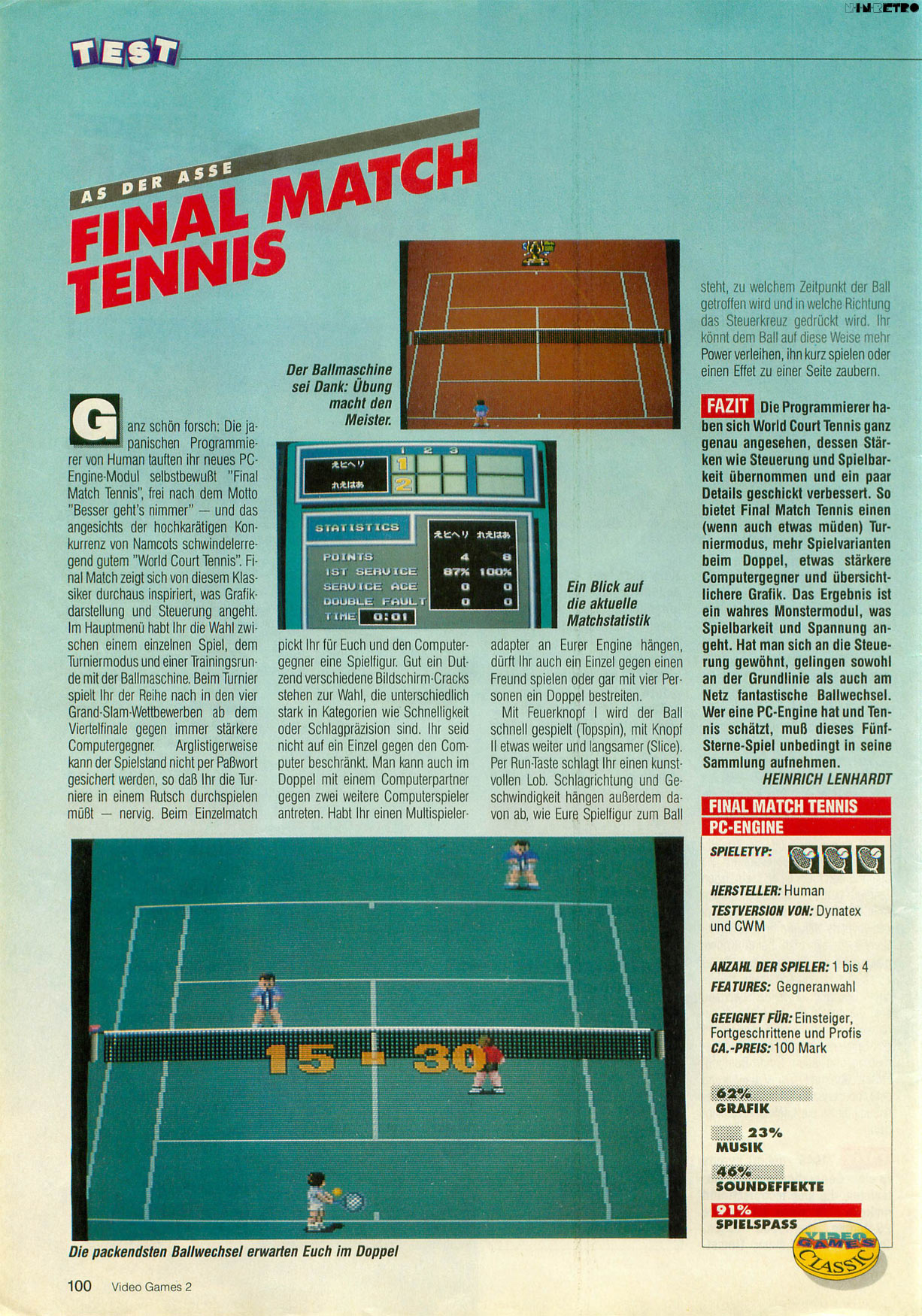 War lange Zeit das beste Konsolen Tennis aller Zeiten, auch noch deutlich stärker als World Court Tennis. Erst Virtua Tennis konnte diesen Titel noch übertrumpfen. Allein dieses Spiel rechtfertigt schon den Kauf einer PC-Engine.