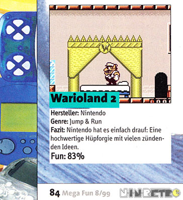 Wobei ich bei dem Punkt sagen muss, dass die 90% jetzt nur von mir grob umgerechnet wurden, da die Video Games in ihrer Spätphase leider keine %-Wertungen mehr für Handheld-Spiele vergeben hat, sondern nur noch max. fünf Sterne. Da Wario Land 2 allerdings die volle Anzahl abgeräumt hat, dürfte 90% zumindest in die richtige Richtung gehen.