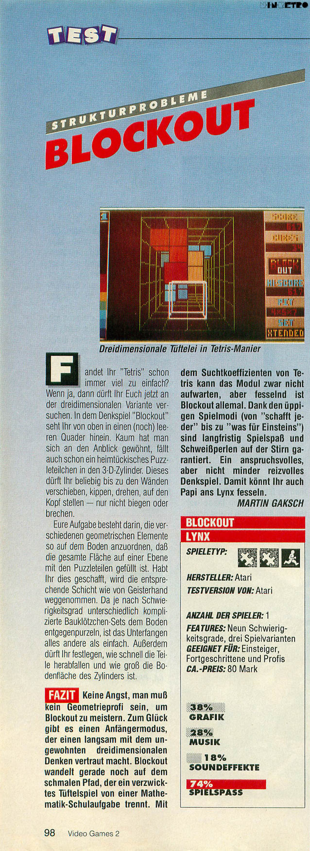 Welcome to the world of Blockout! One of the most absorbing puzzle games ever devised. Drop as many 3-D blocks as you can into a pit without reaching the top. The better you do, the fast the blocks will fall. It takes skill to rotate each block into its best position without leaving any unfilled holes. This is 3-D puzzle action at its best!