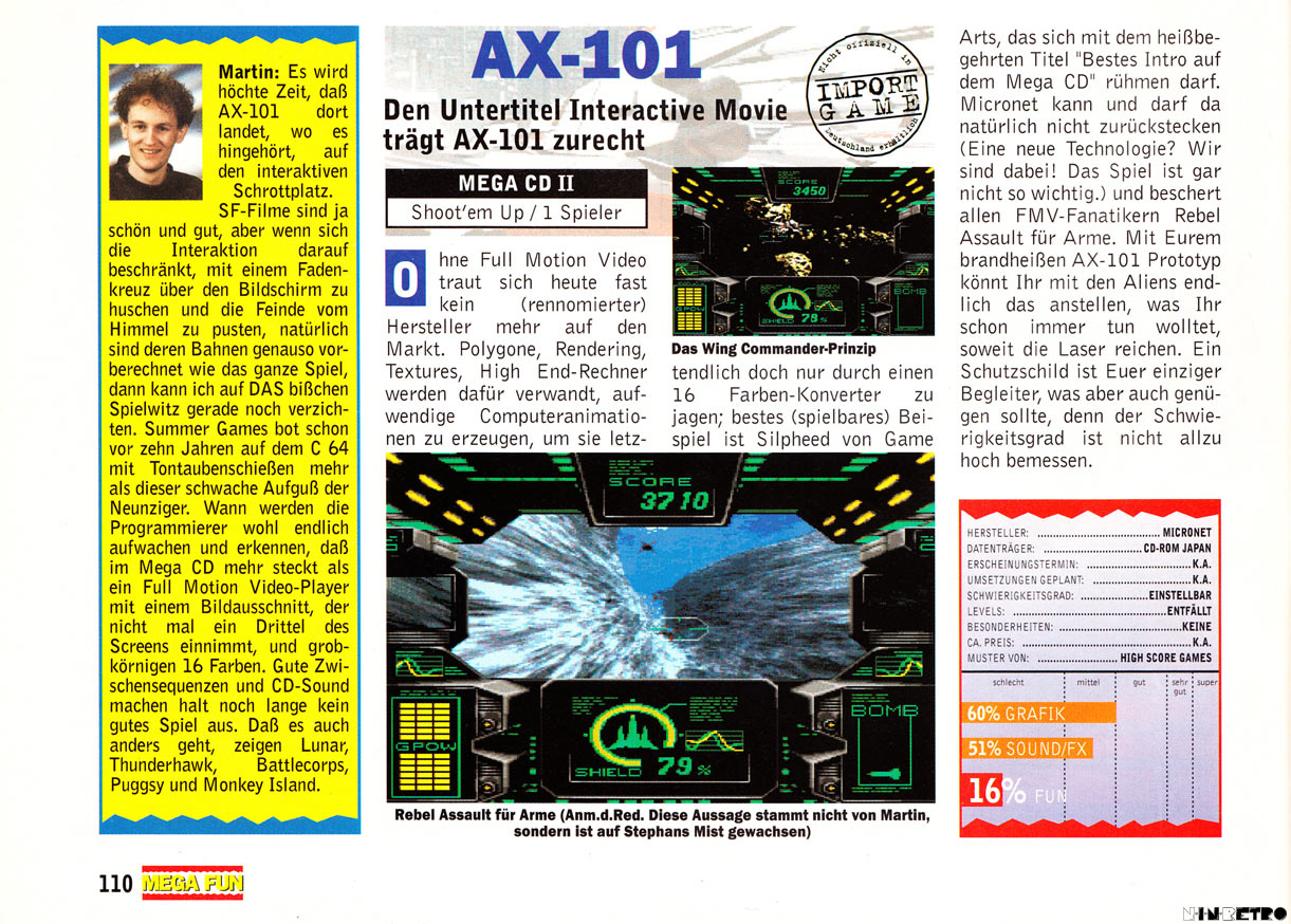 Now you can embark on one of the most visually stunning Sega CD adventures yet! A/X-101 utilizes superior graphics to make the battle to save the human race unfold before your eyes in dazzlingly-rendered animations. You'll fight through swarms of Gurzon fighters on outrageous 3D battle screens so real you'll feel the thrusters at your back as your starfighter twists and turns through space!