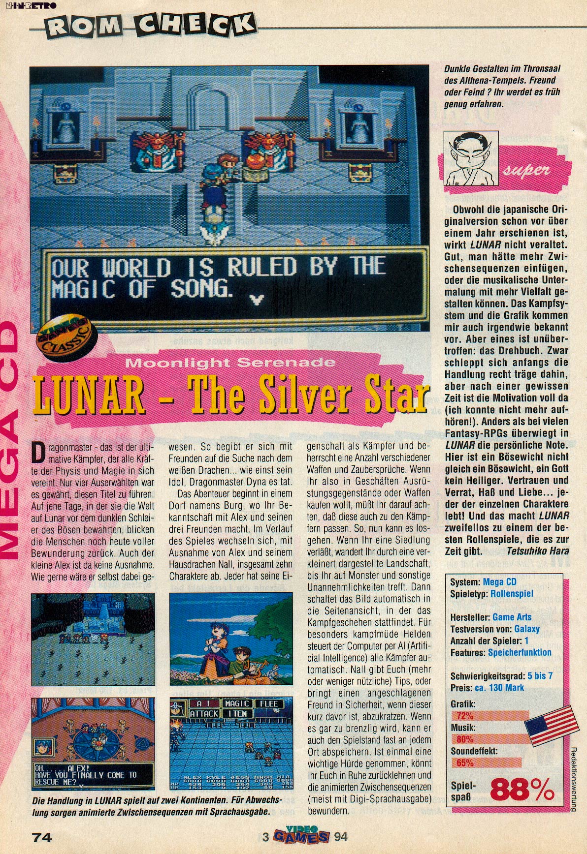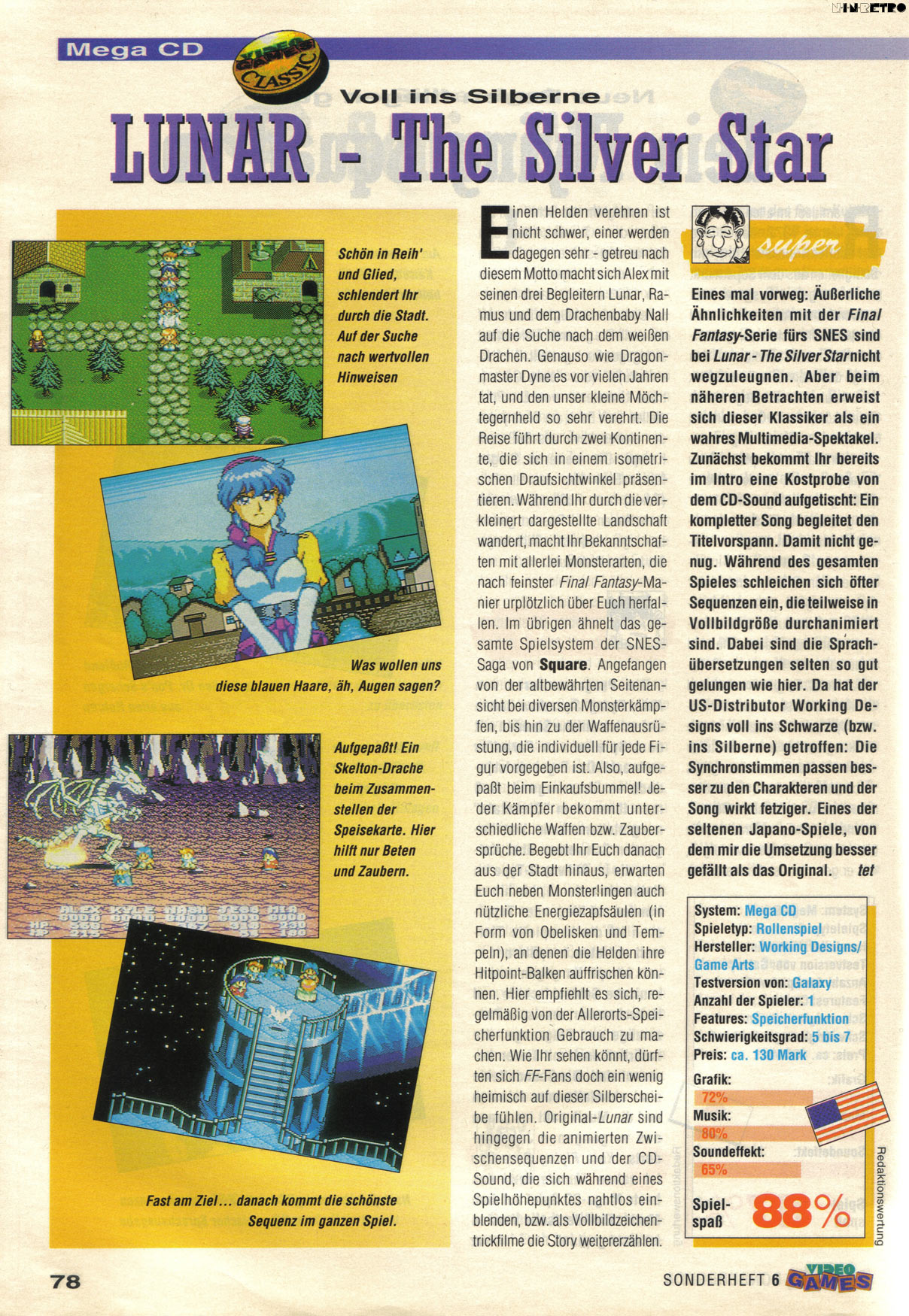 Die Lunar-Saga gehört nicht zum Besten was es an RPG´s gibt. Aber die Sache mit den passenden Voices, FMV´s und der damit veranschaulichten Story macht die Titel interessant. Working Designs gehören zu den besten FMV-Schmieden in Anime-Spielen. Das haben sie öfter bewiesen, besonders auf dem Mega CD. In Rollenspielen kommt es auf die Atmosphäre an...davon strotzt die Silver Star Story sehr. Einige Gameplay-Schwächen kann man daher verzeihen. Ich habe übrigens kaum einen Unterschied in den beiden Portierungen, PSX und Saturn, feststellen können und tendiere ganz klar zum Mega CD (eine geile Konsole!...nur leider auch Sackteuer ).