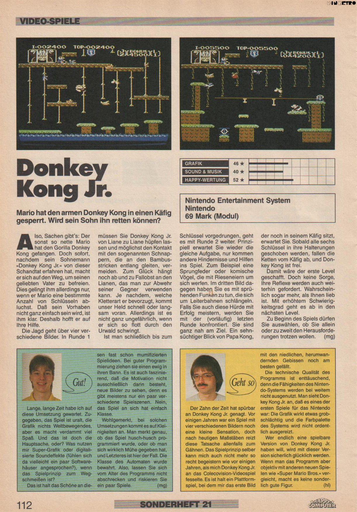 Zu dem Spiel kann ich auch eine kleine Geschichte erzählen. Donkey Kong Jr. befand sich auch mal in meiner Sammlung, aber eher zufällig, da ich damals in den Laden ging und erst mal Super Mario Land im Regal stehen sah und ich total begeistert war, dass es ein neues SM-Spiel gab, das sogar nur 50,- DM kostet. Die zwei Dinge die mir nur komisch vorkamen war zum einen, dass das Spiel den Screenshots auf der Packung schwarz-weiß war, aber ich dachte mir, das wird wohl der Grund sein wieso es so billig ist (Farbe kann man für so einen Preis auch nicht erwarten ), und zum anderen der Schriftzug "Game Boy", der mir zwar bekannt vorkam, aber den ich zu dem Zeitpunkt nicht zuordnen konnte. Ich muss dazu sagen, dass zu jener Zeit der Game Boy brandneu auf dem Markt war und bisher nur wenig Werbespots liefen und ich den Namen wohl deshalb noch nicht so verinnerlicht hatte, zumal ich erst später anfing Spielezeitschriften zu lesen. Auf jeden Fall kaufte ich das Spiel, ging dann aus dem Laden und kurz darauf fiel mir dann plötzlich ein was es mit "Game Boy" auf sich hatte. Also nochmal zurück ins Geschäft um das Spiel zurückzubringen. Ich weiß heute nicht mehr genau ob mir der Verkäufer im Laden das Geld nicht mehr zurückgeben sondern das Spiel nur umtauschen wollte, oder ob ich einfach trotzdem ein Spiel mit nach Hause nehmen wollte, auf jeden Fall fragte ich was die günstigsten NES-Titel wären, die sie zur Zeit da hätten, da ich nicht nicht viel mehr Geld als die 50,- DM dabei hatte, und da wurde mir eben Donkey Kong Jr. für 60,- DM vorgelegt. Also legte ich letzten 10,- DM die ich hatte drauf und nahm das mit. Ein paar Jahre später habe ich das Spiel dann leider zusammen mit ein paar Anderen auf einem Flohmarkt verkauft, was aber das einzige Mal war, dass ich Spiele verkauft habe, seither behalte ich sie alle.