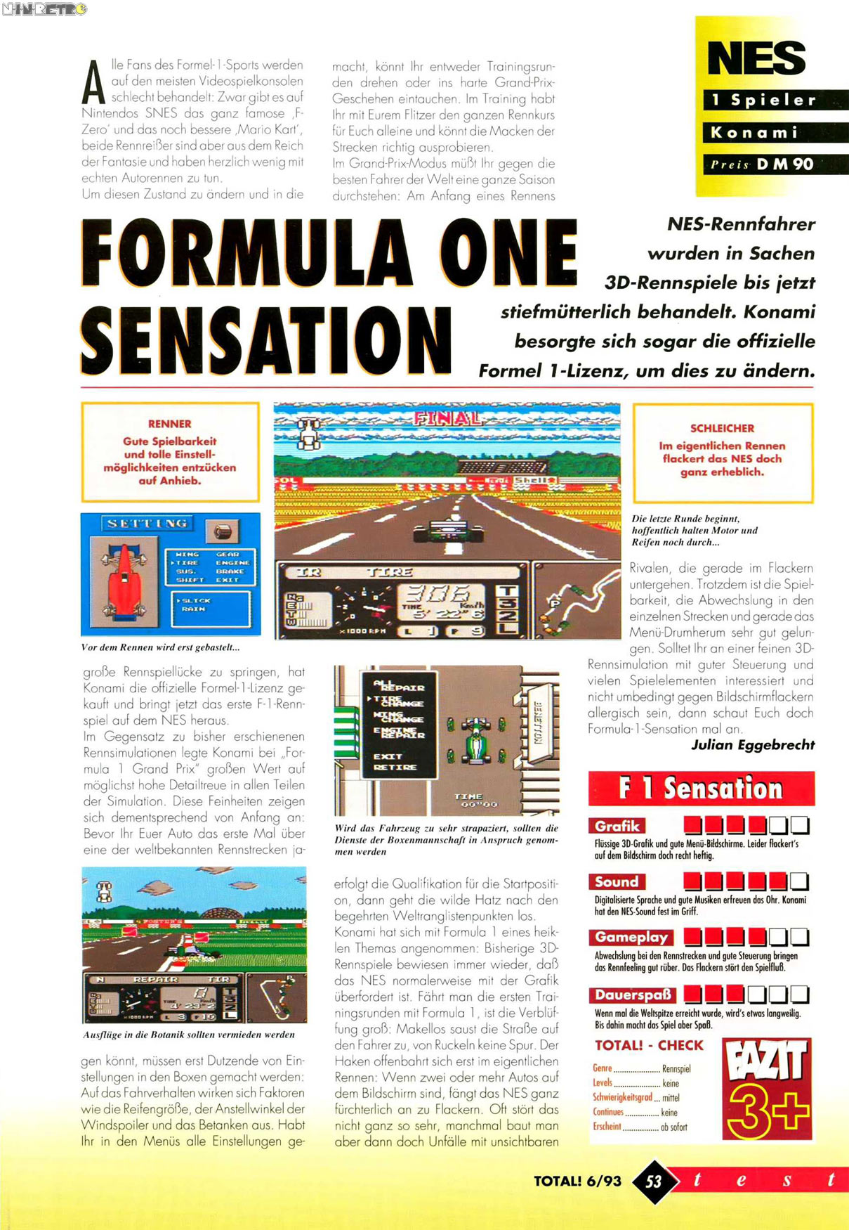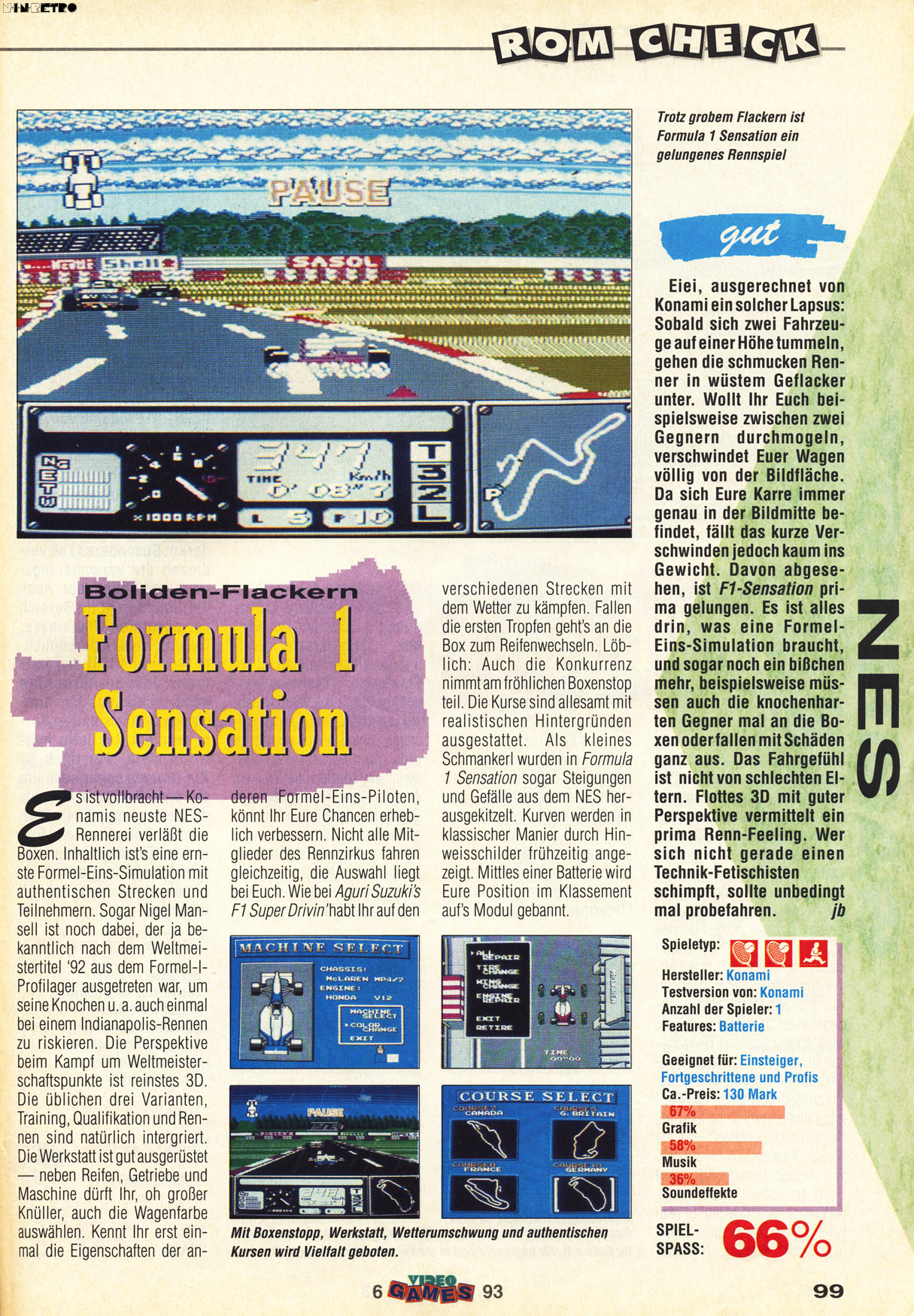 Nach der Lektüre dieses Tests habe ich mir längere Zeit überlegt, mir das Spiel zuzulegen, ließ es letzten Endes aber doch bleiben, weil ich mir wegen des beschriebenen Spriteflackerns zu unsicher war. Aus heutiger Sicht war das sicherlich kein Fehler, denn in meinen Augen altern die Vertreter kaum einer anderen Spielegattung so schnell wie die der Sport- und Rennspielgenres. So waren mit der Veröffentlichung von F-Zero 1990 praktisch alle bis dahin erschienenen Rennspiele auf einen Schlag überflüssig. Im Vergleich mit dem Fahrgefühl, das das Kippen, Drehen und Verschieben des Bitmap-Untergrunds nun ermöglichte, wirkten selbst die besten Pseudo-3D-Rennspiele wie z. B. Formula 1 Sensation mehr als angestaubt.