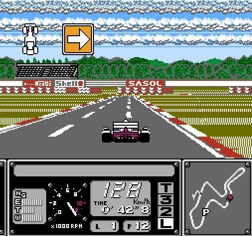 Auf einer Konsole, die nur acht 8x8-Pixel-Sprites pro Zeile darstellen kann, wäre die Cockpit-Perspektive die bessere Wahl gewesen. Ein zu zeichnendes Auto weniger hätte die Gefahr eines sprite overflow deutlich gesenkt.