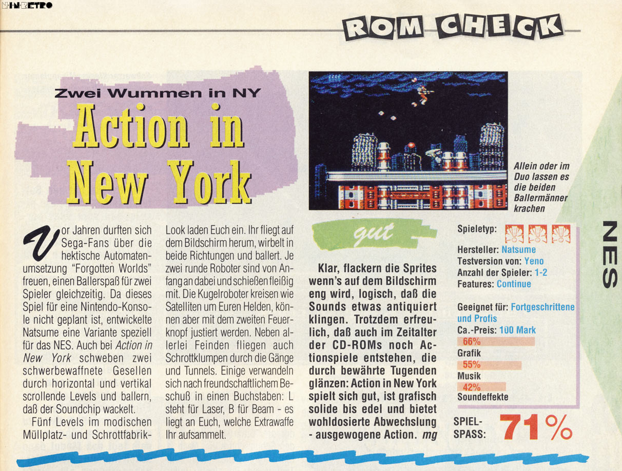 Für das NES ist Action in New York ein klasse Spiel. Leider wird es ab dem 4. Level zu schwer, gerade wenn man kein Profi im Shoot`em up Genre ist. Aber gerade zu zweit macht es nochmal extra viel Spaß und wird entsprechend einfacher. Achja und technisch ist es für NES Verhältnisse auch ziemlich gut. Gerade die Musik rockt!