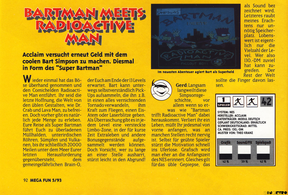 Überhaupt finde ich, dass für die alten Konsolen die Simpsons-Lizenz nur für mittelmäßige bis totale Gurkenspiele verwendet wurde. Kenne bis jetzt jedenfalls kein wirklich gutes Modul.