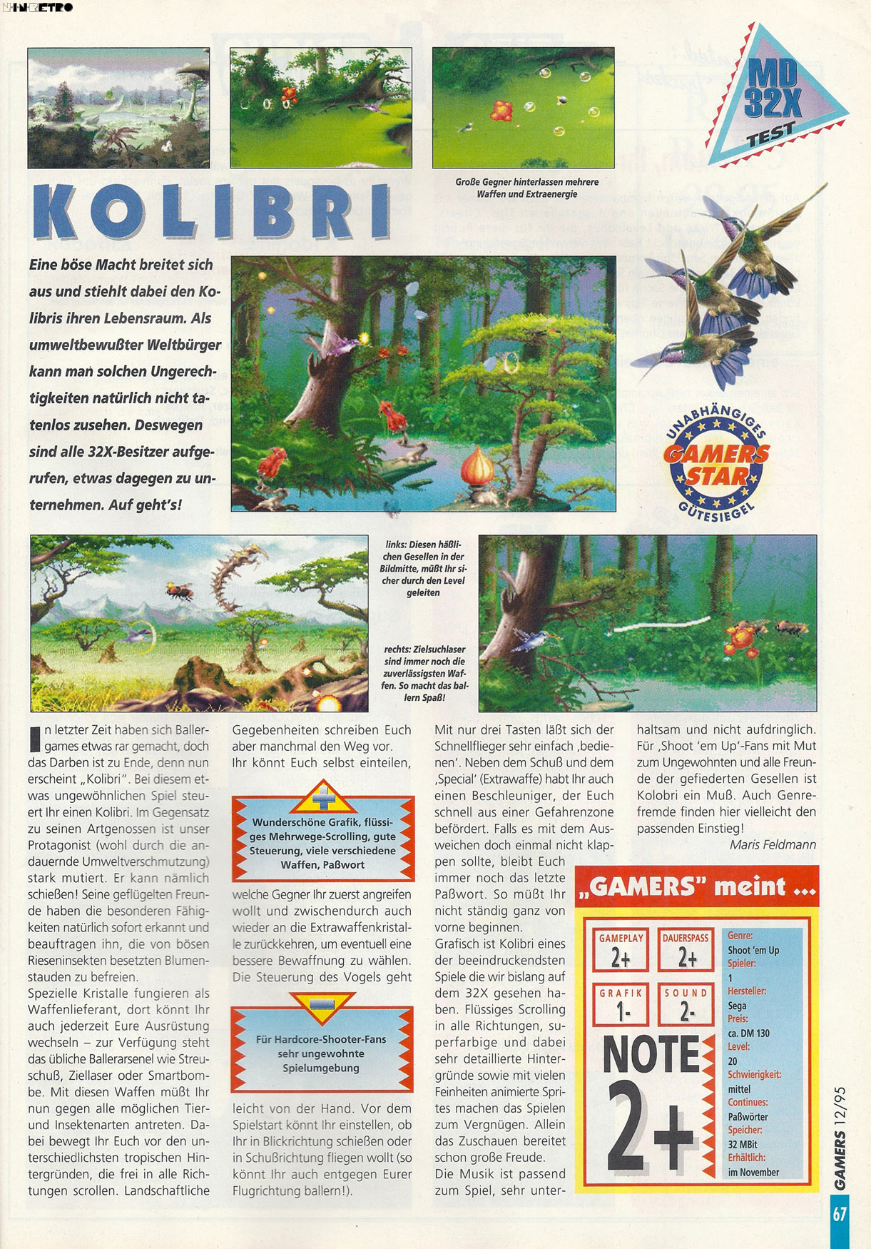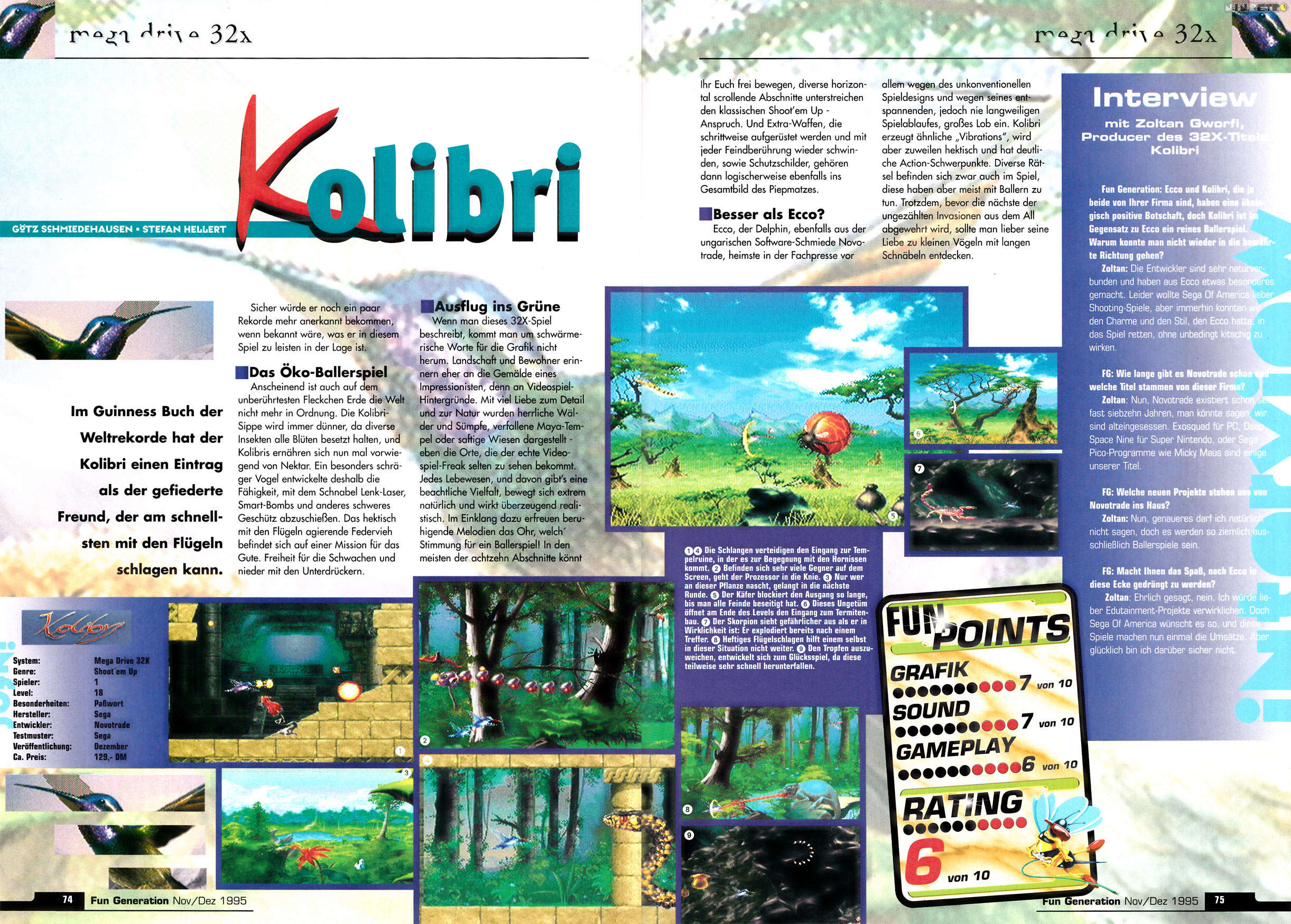 Ein tolles Spiel. Ein gewaltfreier Shooter? Warum eigentlich nicht. Die Grafik, Musik und auch das Leveldesign sind wirklich sehr gut. Wer tatsächlich ein 32X hat, sollte Kolibri auch in der Sammlung haben.