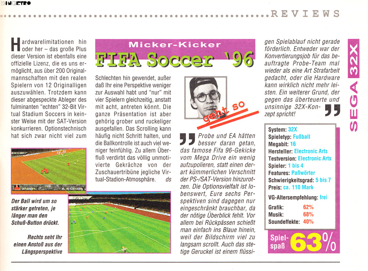 Das erfolgreichste Fußballspiel aller Zeiten ist für das SEGA 32X jetzt noch verbessert und aktualisiert worden. FIFA Soccer '96 bringt Ihnen die Fußballaction der Welt ins Haus. Mehr als 3.500 Spieler, 200 Mannschaften und 12 Ligen erwarten Sie! Mit seiner umwerfenden Graphik, 7 Kameraperspektiven, dem 4-Spieler-Modus und der bekannten Optionsvielfalt ist FIFA '96 das Fußballerlebnis schlechthin.