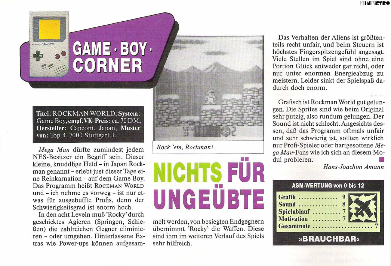 Die ASM vergab imo eine relativ niedrige Wertung für die doch recht gelungene Umsetzung. Nur den Umfang empfand ich schon damals im Vergleich zu den NES-Mega-Man-Spielen für etwas zu gering. Im Grunde wurden einem gerade mal die hälfte der Levels geboten. Dafür war es allerdings auch etwas schwerer, was z.T. auch an dem schlechten Displays der alten GB-Modelle lag... aber Durchgespielt habe ich es damals trotzdem, von daher kann es eigentlich gar nicht zu schwer gewesen sein.