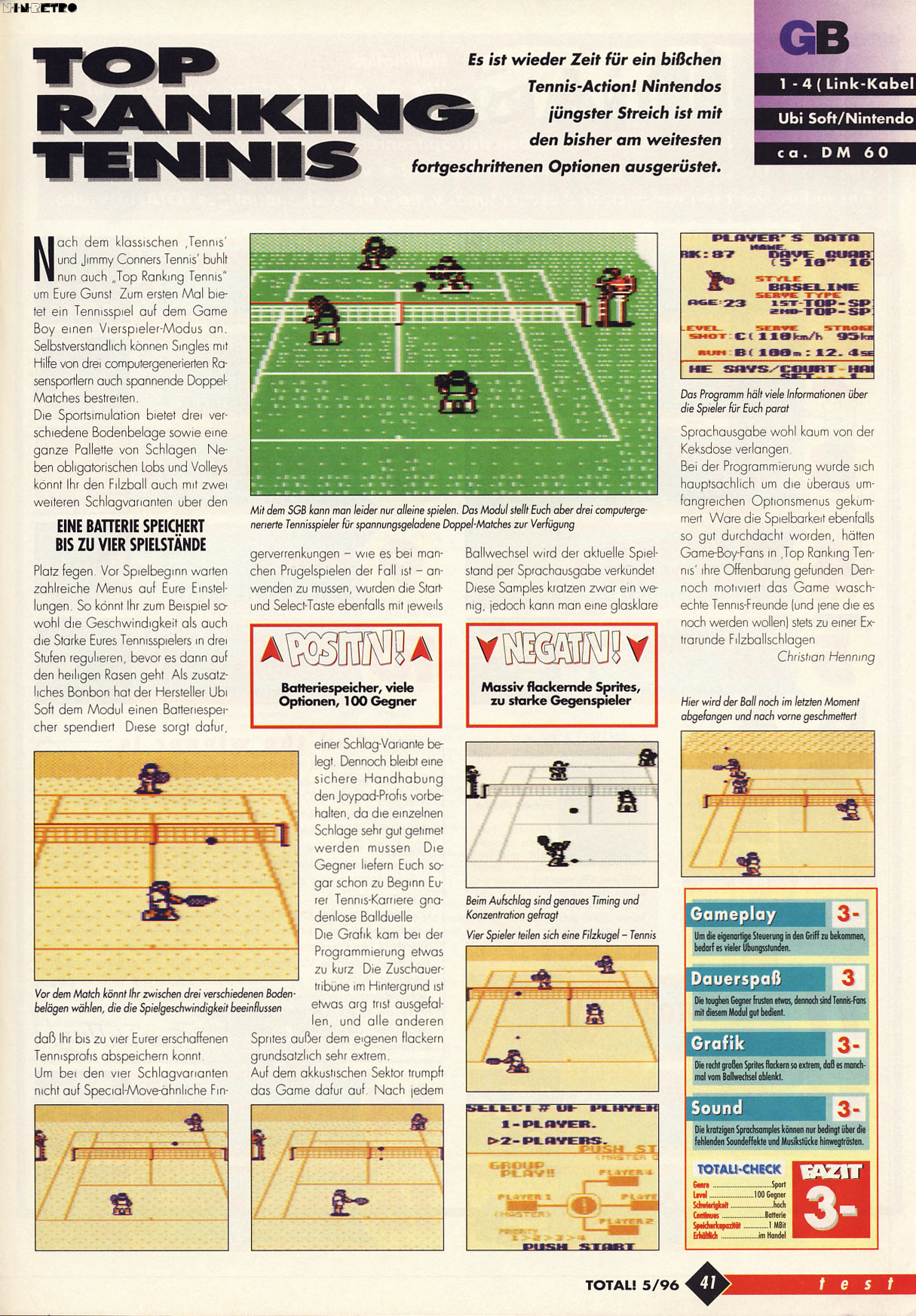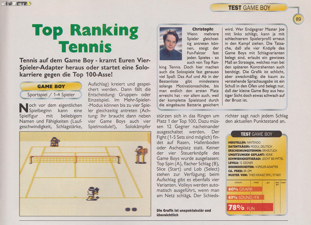 Im Nachhinein ist das Flackern (vielmehr das ständige kurze komplette Verschwinden) der Sprites aber bei Top Ranking Tennis echt sehr krass. Schade, denn spielerisch ists für ein Gameboy-Sportspiel ziemlich gut gelungen.