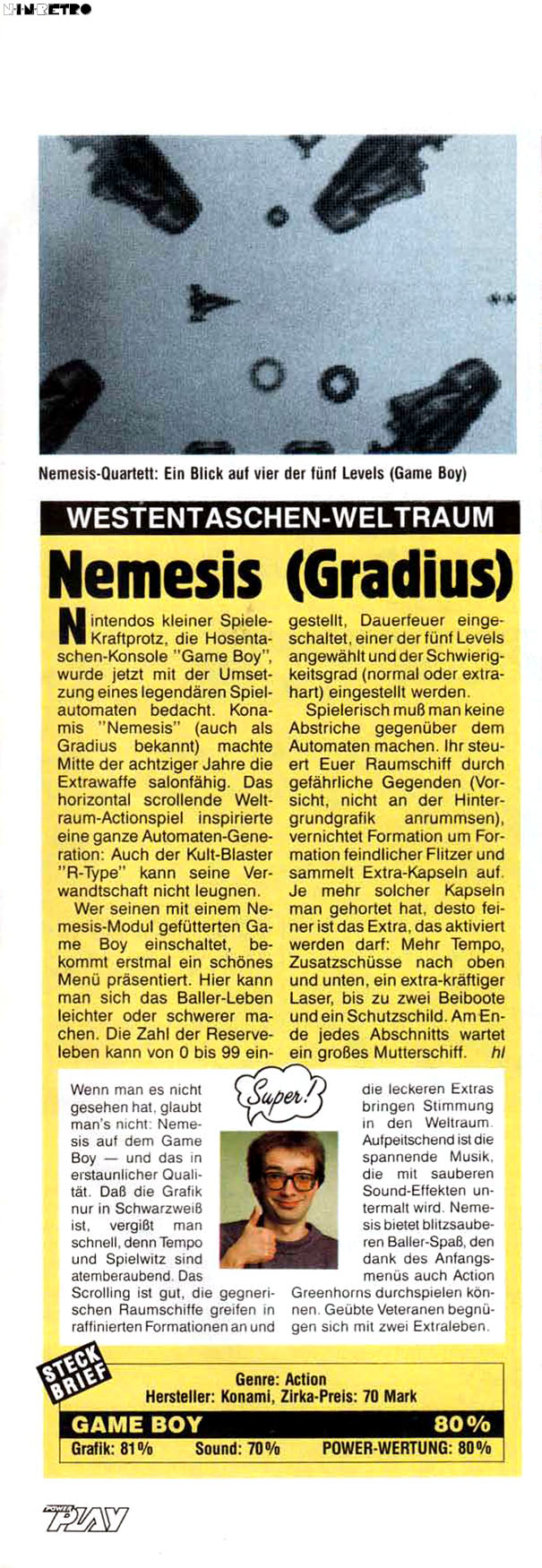 Oben,Oben,Unten,Unten,Links,Rechts,Links,Rechts,B,A,Start! Ahhh...ich liebe Konami-Spiele. Das ging bei Probotector und auch hier bei Nemesis. Klar war das Spiel danach super einfach. Aber trotzdem hatte es Spaß gemacht und man konnte es mit seinen Kinderhänden durchspielen.