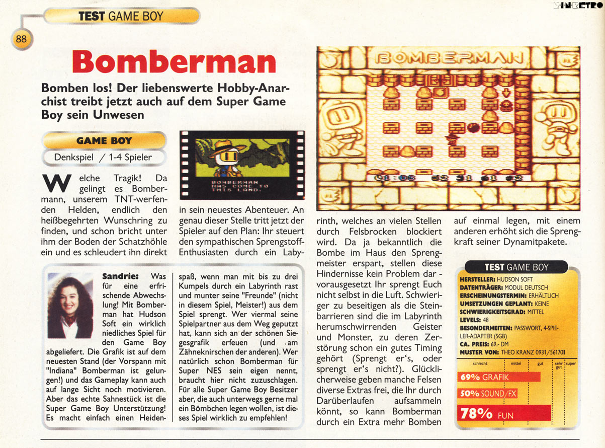 Bomberman is searching the depths of the earth in hopes of finding the Legendary Treasure. In the Story Mode, guide him through 48 levels of puzzle-solving action, collecting power-up items and defeating monsters along the way. The Battle Mode is the old favorite, where one to four players battle it out on six different maps.