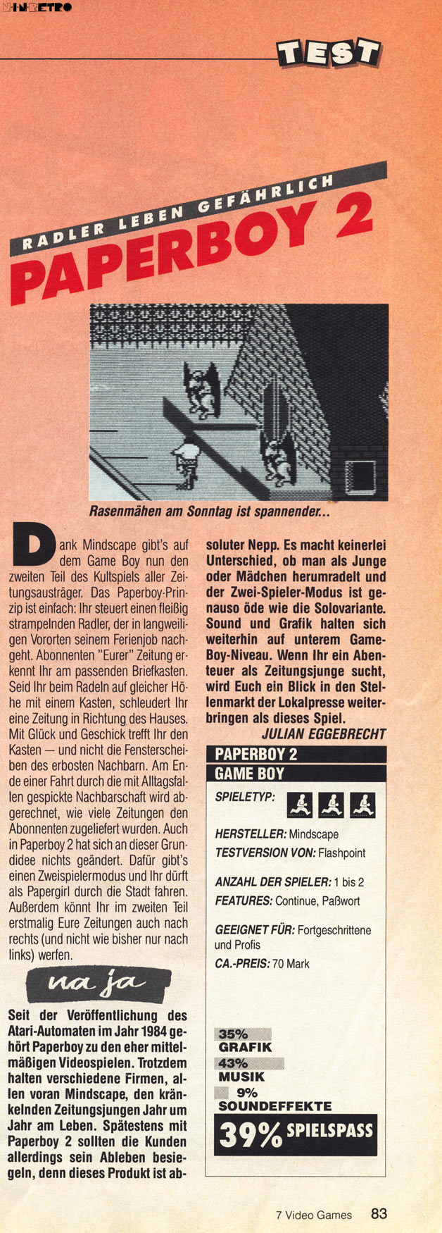 Aber was die VG schreibt stimmt einfach nicht. Grafisch ist das Spiel für GB-Verhältnisse sehr gut umgesetzt - ok ,der Sound ist jetzt nicht unbedingt so toll - und spielerisch ist es definitiv über "na ja" angesiedelt. Mehr Spaß als selber Zeitungen auszutragen machts allemal.