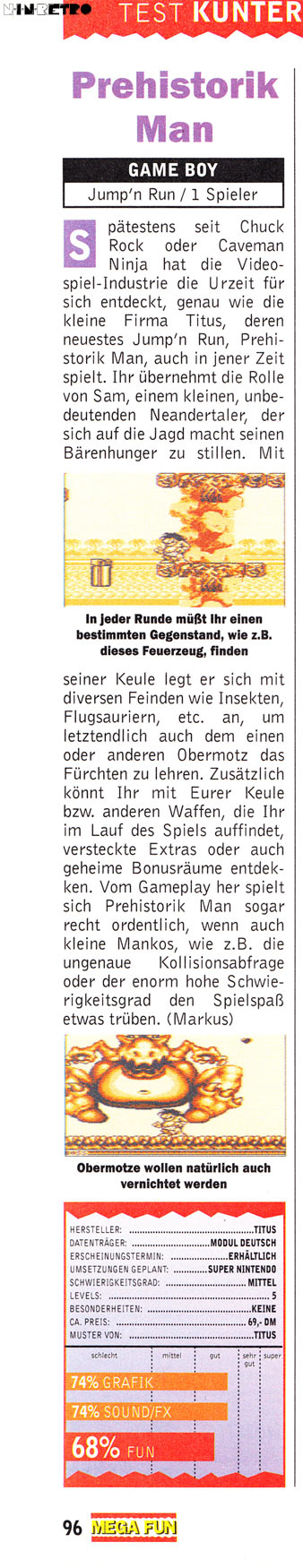 Grafisch und akkustisch unglaublich, was Titus hier geleistet hat. Technisch kenne ich eigentlich kein Spiel auf dem Gameboy, das besser ist. Prehistorik Man bietet Paralax-Scrolling auf mehreren Ebenen, riesige Endgegner, und unglaublich detailierte Umgebungen. Durch Mischen der Graustufen in Gitterrastern hat man quasi zusätzliche Grautöne geschaffen, so dass eine noch feinere, plastischer wirkende Grafik möglich ist.