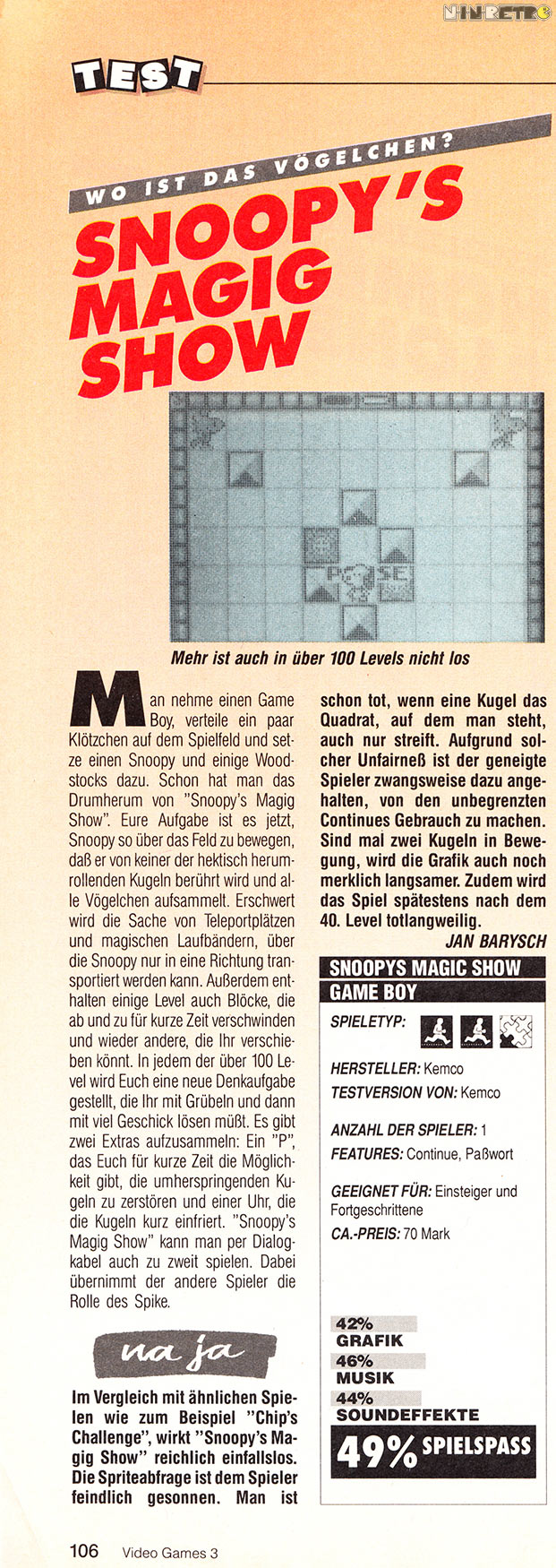 Das Spiel fand ich damals gar nicht so schlecht, es hat mich eine Zeitlang ganz gut unterhalten. Es gibt sicher bessere Spiele, aber ich denke es hat mehr als die 49% verdient. Ich sehe es eher im 60-70% Bereich auch wenn der Schwierigkeitsgrad irgendwann ganz schön ansteigt und frustet. Durch die Passwortfunktion kann man aber jederzeit wieder im zuletzt gespielten Level einsteigen.