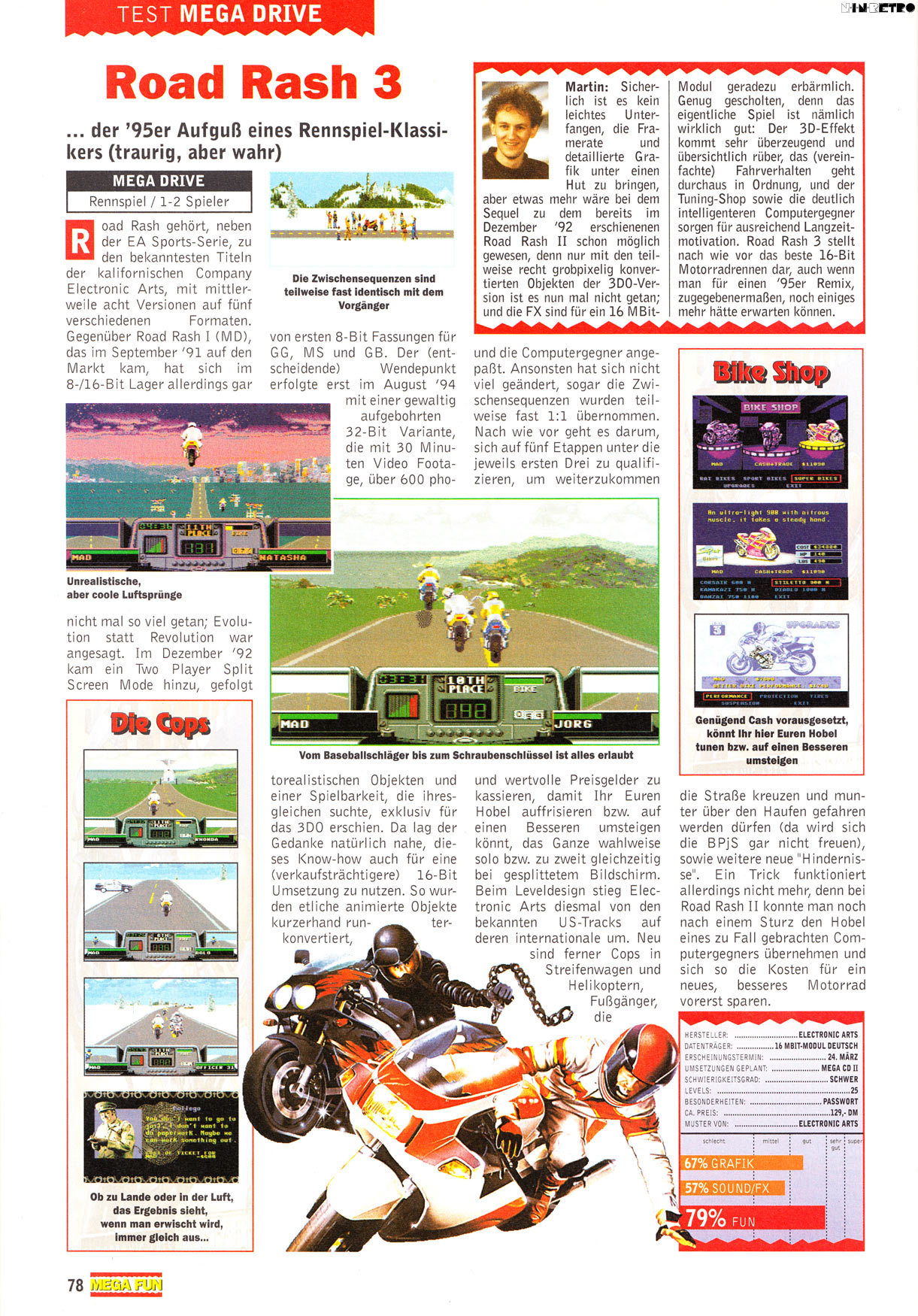 Das war in beiden Vorgängern spürbar besser. Grafisch ist sowieso Teil 1 (!!!) am besten. Da gibt es noch richtige Rückspiegel und auch die Strecken sehen am schönsten aus. Von Road Rash 3 würde ich daher eher abraten, Teil 1 und 2 genügen auf dem MD vollkommen.