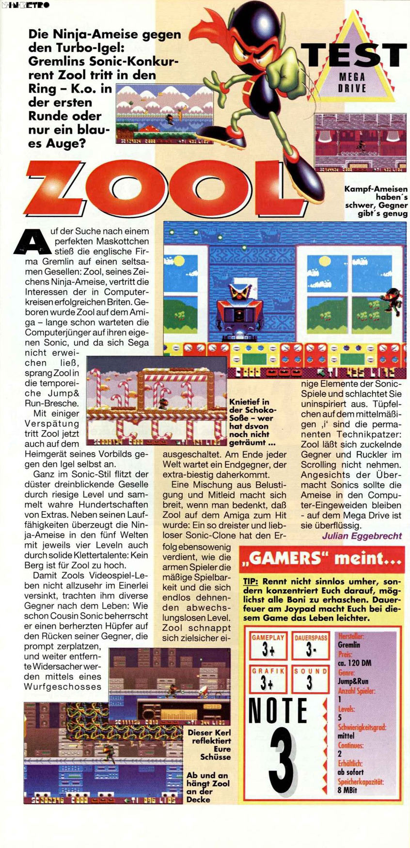 Einmal pro Jahr wird die Welt der Computergames von einem Spiel aufgerüttelt, das so beeindruckend, schnell, farbenfroh, großartig, anspruchsvoll, super, atemberaubend, abwechslungsreich, unglaublich und voller fabelhafter Features und irrer Überraschungen ist, daß jeder gleich weiß: "Das ist der absolute Knüller!" In diesem Jahr is das zweifelsohne ZOOL, THE NINJA FROM THE "Nth" DIMENSION!