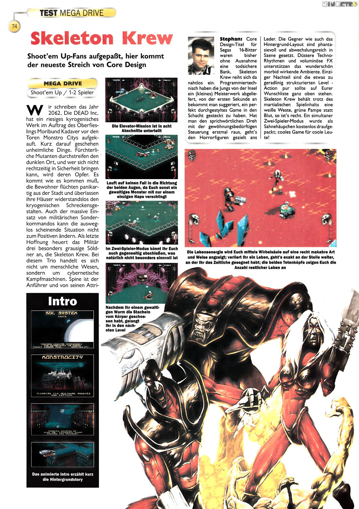 Sie wollen einen Mega-Laser mit genug Power, um eine Stadt in Schweizer Käse zu verwandeln? Können Sie haben! Sie wollen es, gegen gute Bezahlung natürlich, mit unzähligen Psykogenix-Mutanten aufnehmen? Können sie haben! Sie wollen sich durch sechs RIESIGE Levels voller Geheimzonen, lebensgefährlicher Krew-Fallen und abgefahrener Gebäude kämpfen um am Ende jedes Levels den gräßlichen Psykos gegenübertreten? All das in der fantastischen, isometrischen 3D-Perspektive? Obendrein werden Sie auch noch mit einem außergewöhnlich attraktiven, Super-High-Tech-Exo-Skelett ausgestattet, mit dem Sie einer ganzen Armee gegenübertreten können, ohne auch nur einen Kratzer abzubekommen! Tja, all das können Sie haben - aber nur, wenn Sie sich mit Spine, Joint und Rib, auch bekannt als die SKELETON KREW, in ihrem ersten haarsträubenden Abenteuer zusammentun!