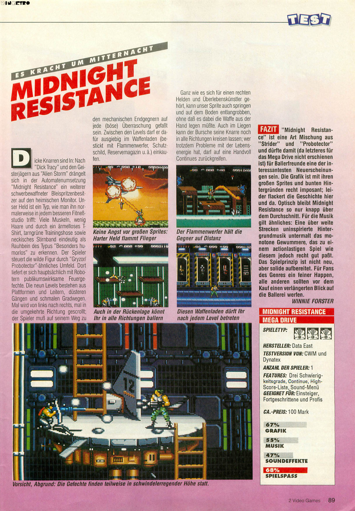 Die Steuerung ist anfangs ziemlich gewöhnungsbedürftig, geht aber nach einiger Zeit gut. Ich mochte bei solchen Spielen schon immer Musik, die Gefühle wie Aufbruchsstimmung, Patriotismus und "wir stürmen gegen die Gefahr an" wecken. "Gallantry" aus Raiden oder "Sortie" aus Gauntlet IV sind solche Stücke und die Musik aus Midnight Resistance bringt diese Stimmung gut rüber.