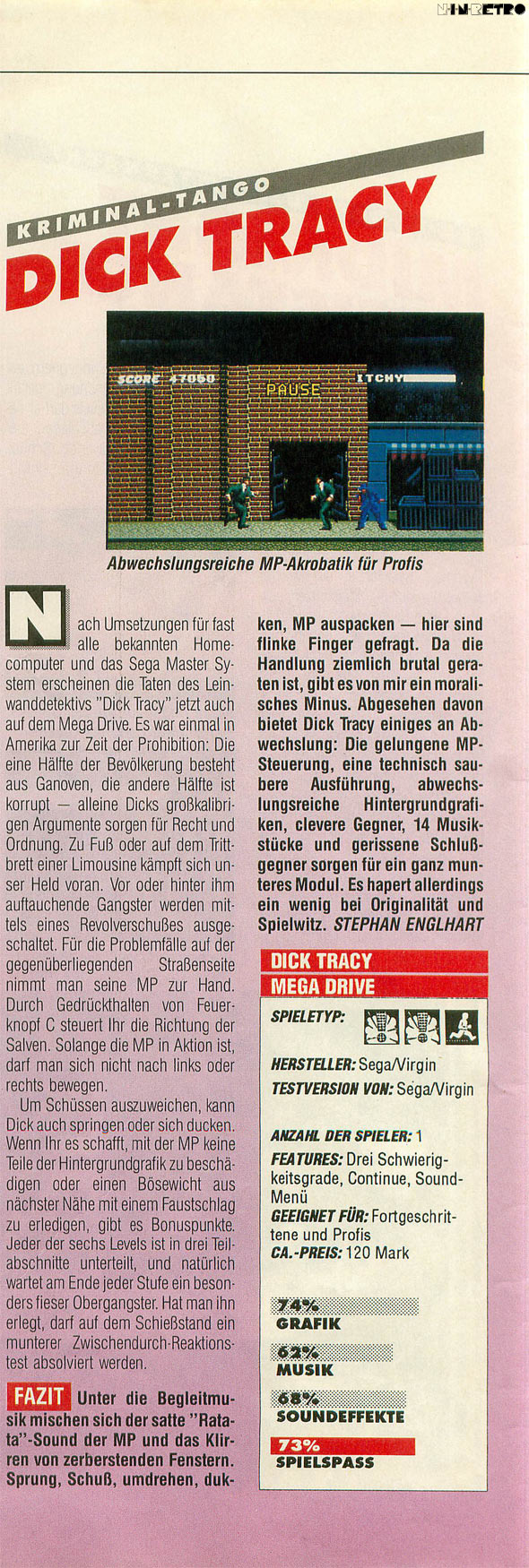 Dick Tracy, the legendary comic strip hero, is back - and he's tougher than ever! A call just came in... "Tracy, the streets are in turmoil. Big Boy Caprice has every last one of his slimeballs armed to the teeth! Eyewitness reports have "Lips" Mantis, "Flattop," and "The Brow" roaming the city, with armies of thugs in tow..." It's up to you! Take your pistol and machine gun, and hit the pavement! You've got a city to save!