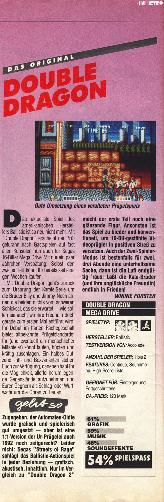 Das Spiel ist ganz in Ordnung. Es kommt zwar niemals an ein Streets of Rage 1 ran, geschweige natürlich an Teil 2 oder 3.., da das Gameplay und auch die Animation/Grafik leider sehr gewöhnungsbedürftig ist. Das Mega Drive Spiel ist aber um einiges fairer als das NES Original, und man darf nicht vergessen, dass es sich um ein sehr frühes 16-Bit Beat 'em up handelt, daher finde ich das Spiel, dass ich zudem besitze, immer noch ganz in Ordnung.