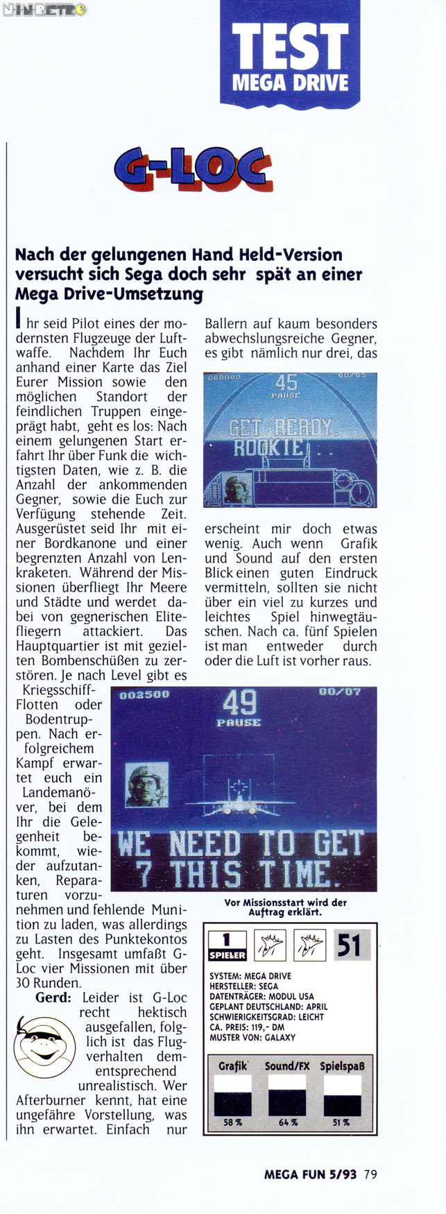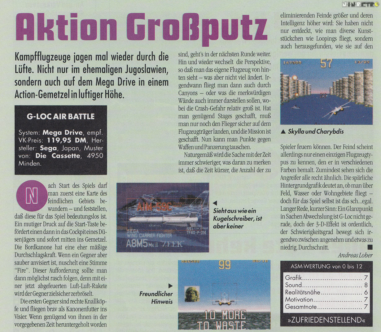 Ich habe immer gerne After Burner gespielt und leider auch dieses Spiel gekauft. Müll wäre übertrieben, aber es ist eine Flug-Sim...ähm...Schande. Den Automaten habe ich tatsächlich einmal in Hamburg gesehen. Der machte Spaß. Das Mega Drive-Modul ist schlecht umgesetzt und das kann man nicht der Modulgröße in die Schuhe schieben. Die Grundidee ist gar nicht mal schlecht gewesen, die Cockpit-Perspektive gelungen und der Sound ging auch. Es wäre hier viel mehr drin gewesen. Um diesen Flieger hier kann man einen großen Bogen machen, lohnt nicht.