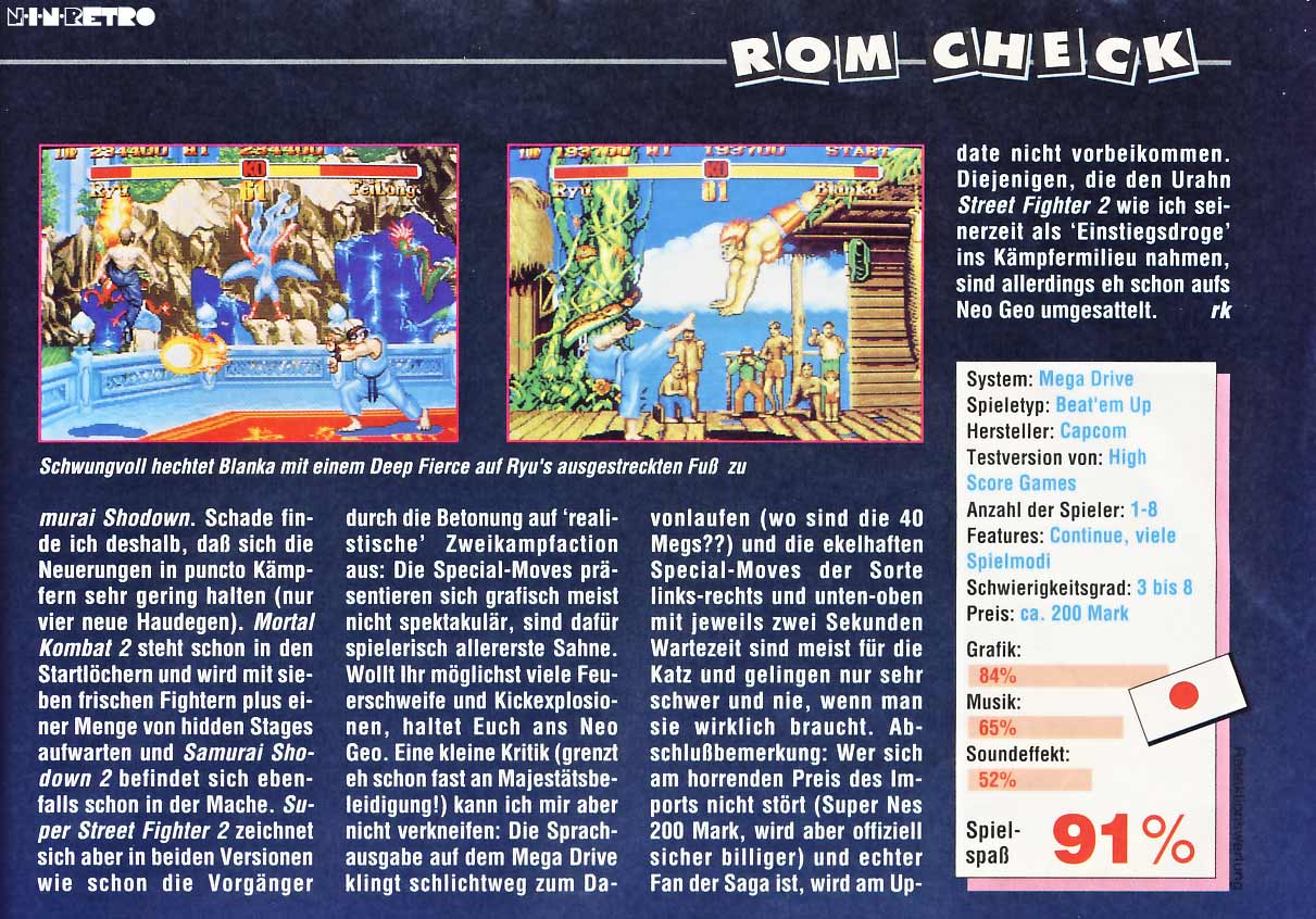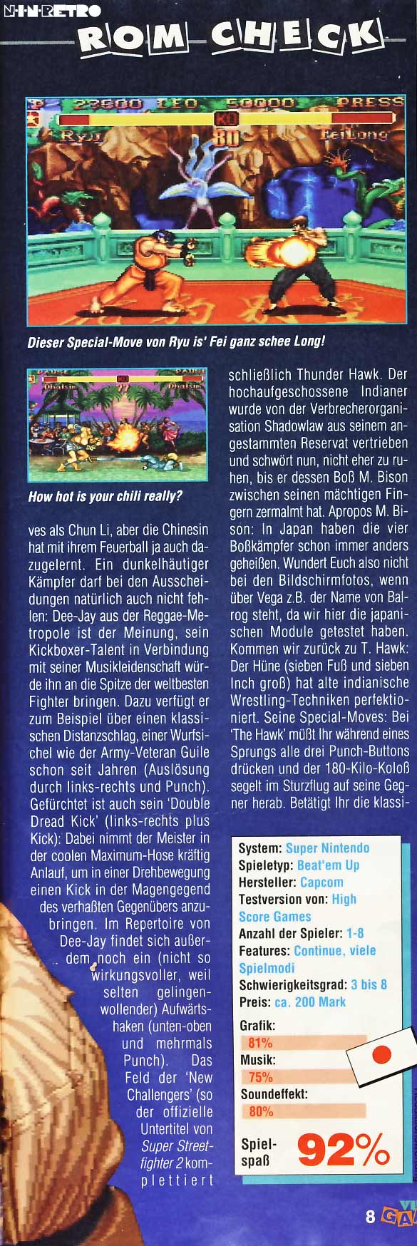 Stimmt, etwas vergleichbar Schlechtes habe ich auf dem Mega Drive auch selten gehört. Die Fachpresse traute sich aber leider nicht, das in dieser Deutlichkeit zu schreiben. Vermutlich wollte man es sich gerade bei einem so wichtigen Spiel wie SSF2 nicht mit dem Teil der Leser verderben, die ihre kindische Markenrivalität pflegen wollten. Auch die Gamers ging nicht viel deutlicher auf den Sound ein und vergab eine mittelmäßige 4+, die zudem nichts am Fazit änderte: Genrereferenz und besser als die Special Champion Edition!