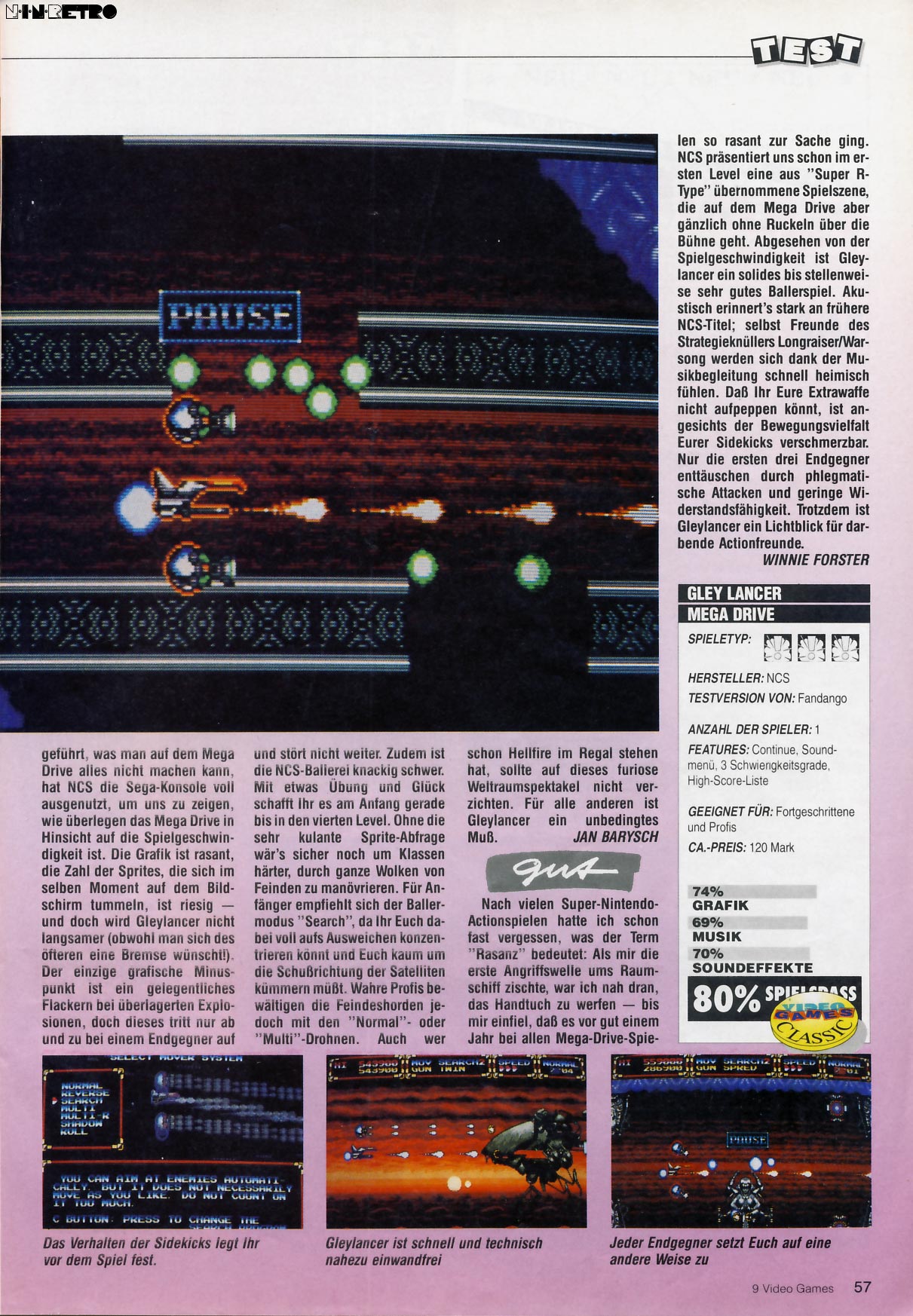 Zwar sind viele Elemente dreist aus R-Type, Thunder Force III oder Salamander geklaut, aber gut zusammengemixt. Technisch gibt es nichts zu meckern. Im Gegensatz zu den Konkurrenzprodukten Gynoug und Hellfire auf dem eigenen Haus bietet GleyLancer deutlich mehr Spielspaß.