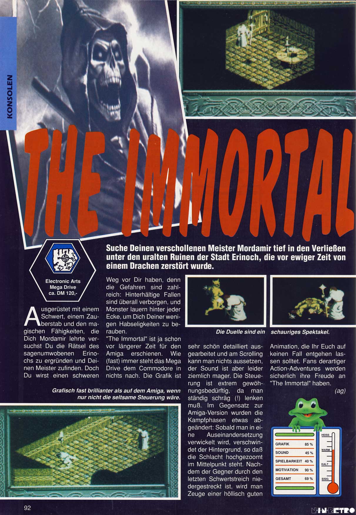Düster, blutig, knackig schwer und sehr spannend. Das beste ist, die PAL-Version ist nicht geschnitten. Das Spiel gehört zum blutigsten, was die 16-Bitter zu bieten haben, ist aber auch in Sachen Gameplay und Story für Fans von Adventuren und RPGs sehr zu empfehlen. Es gibt von The Immortal auch eine NES-Version, die allerdings deutlich hinter dem MD zurückbleibt (aber dennoch gut ist).