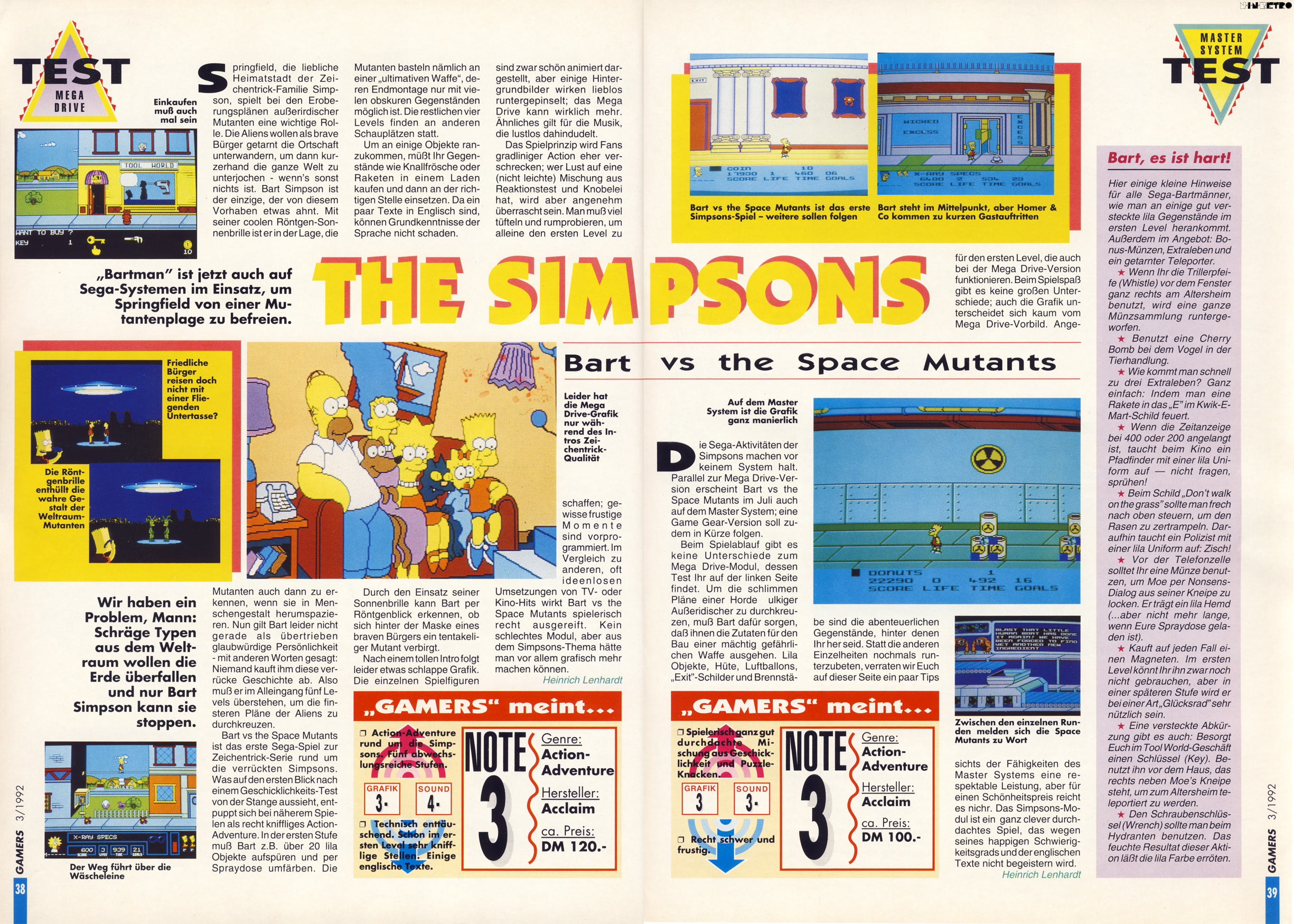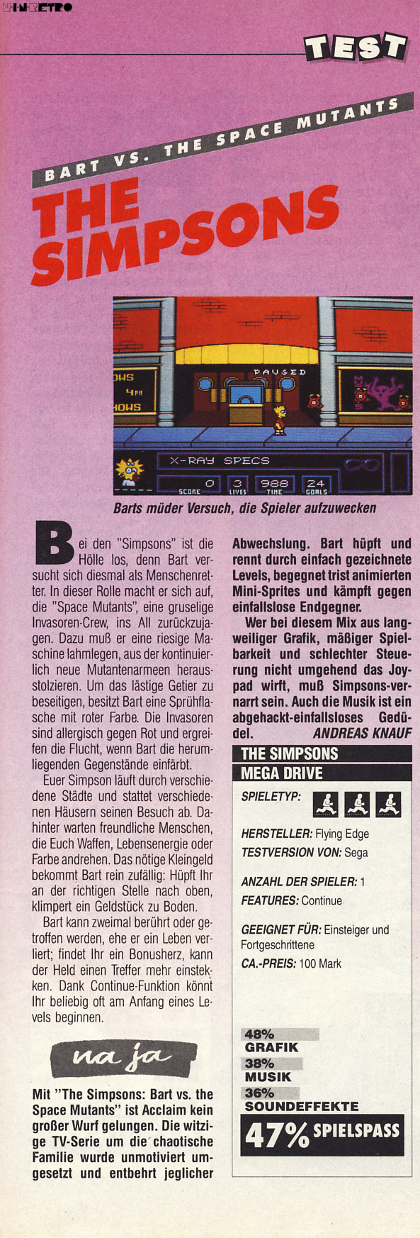 Nachdem ich zu Weihnachten '92 das NES Super Set mit Super Mario Bros., Tetris und Nintendo World Cup bekommen hatte, wollte ich mir im Jahr darauf als erstes separates Spiel auch Bart vs. the Space Mutants kaufen. Wieso ich mir ausgerechnet dieses Spiel ausgesucht hatte, weiß ich gar nicht mehr genau, aber wahrscheinlich hatte es damit zu tun, dass es im NES-Spieleberater auftauchte und die Screenshots so schön bunt waren.