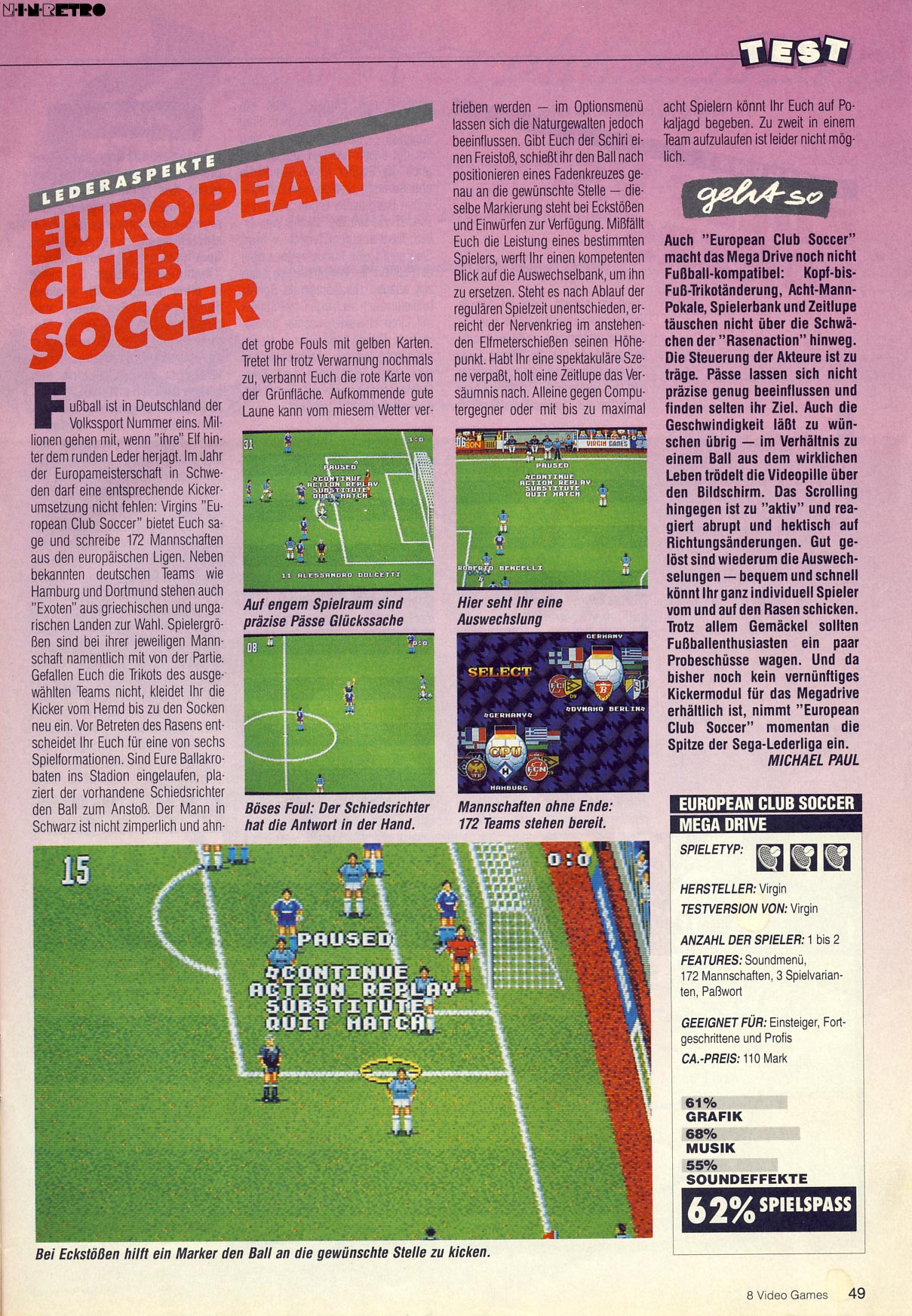 "European Club Soccer" bringt jetzt auf dem Sega Mega Drive den Nervenkitzel der Spitzenspiele in Europas beliebtestem Sport. Spiele gegen mehr als 170 Mannschaften aus der ganzen Welt und kämpfe um den Superpokal, die höchste Auszeichnung im Fußball - nur in "European Club Soccer"!