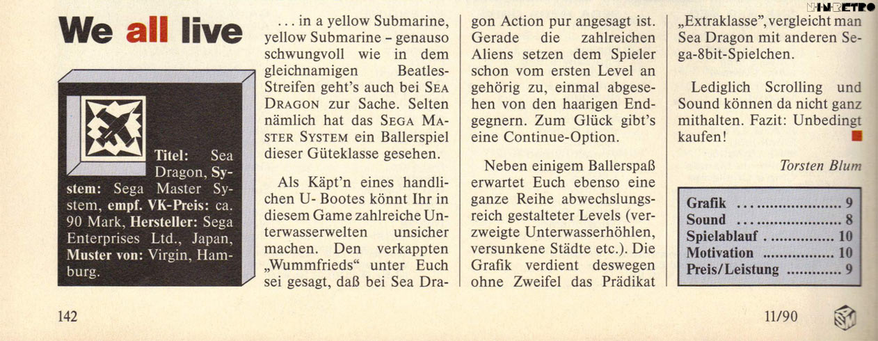 Irgendwie konnte ich im Internet keine Informationen zu einer Umsetzung von "Sea Dragon" für das Master System finden. Aber aufgrund des Testberichts müssen zumindest Testversionen verschickt worden sein.