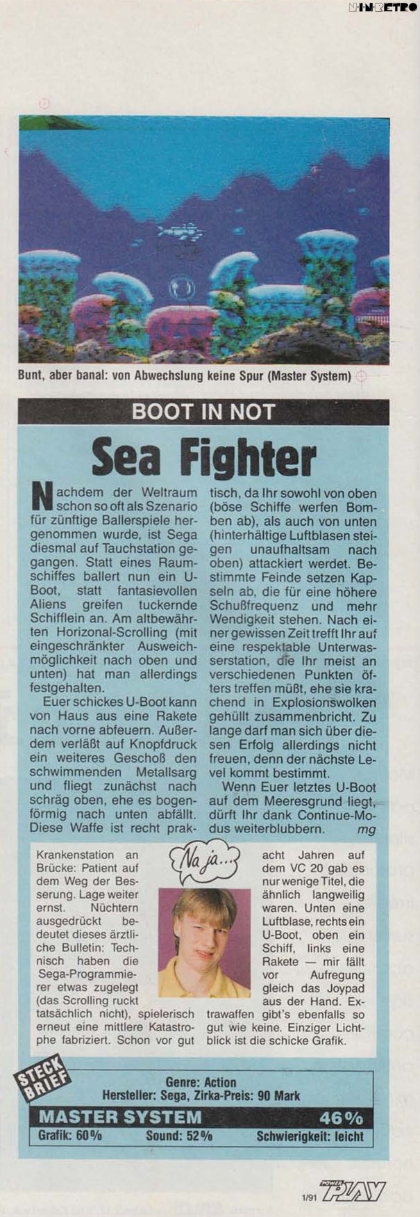 Nachdem ich jetzt den Testbericht der Power Play vorliegen habe, der ebenfalls den falschen Namen trägt (unter den beiden Namen "Sea Dragon" und "Sea Fighter" lassen sich keine Spiele für das Master System finden), das Spiel sich aber anhand des Screenshots als "Submarine Attack" identifizieren lies, gehe ich sehr stark davon aus, dass es sich bei dem von der ASM getesteten "Sea Dragon" ebenfalls um "Submarine Attack" handelt. Von daher sich jetzt beide Testberichte unter dieser Info-Seite zu finden.