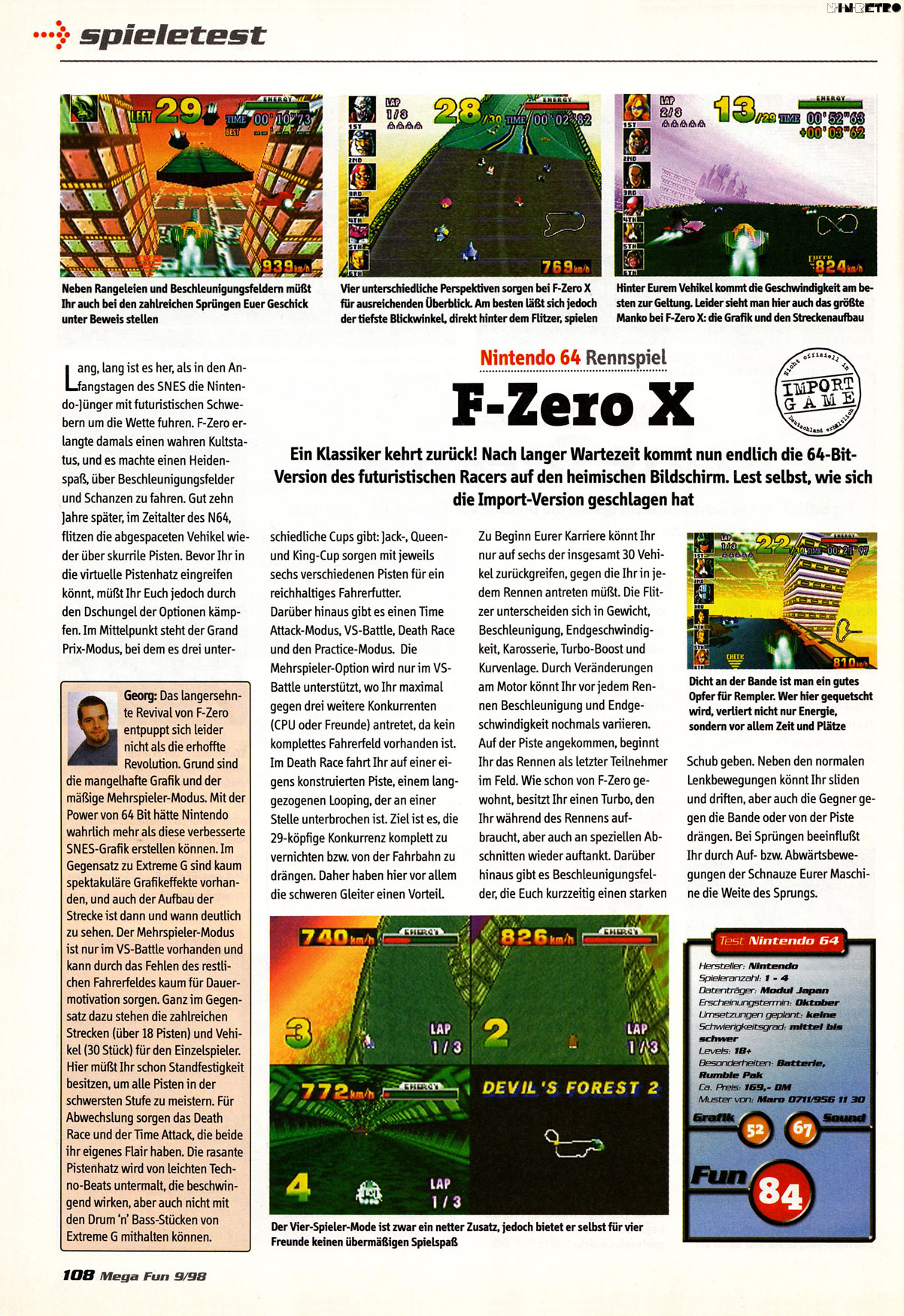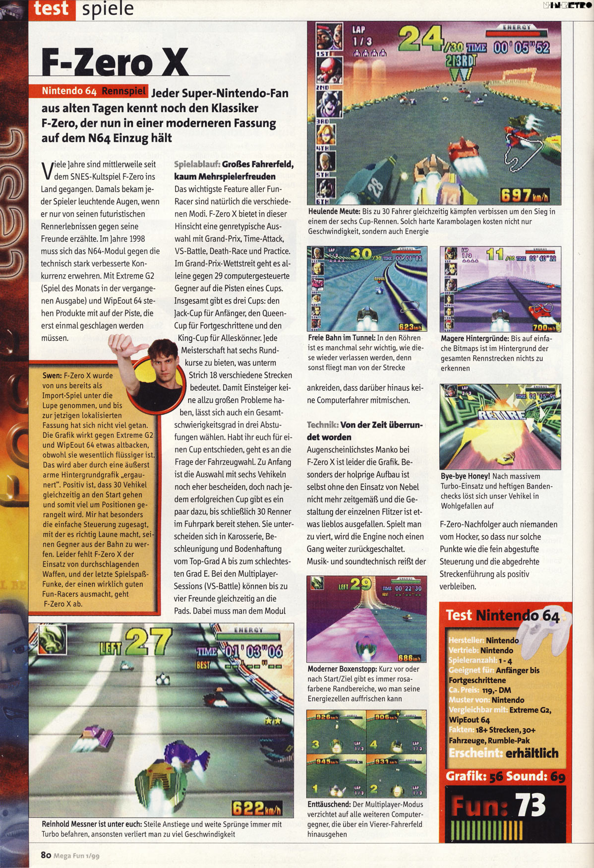 Lustig finde ich, dass sie die Musik in der Mega Fun als leichten Techno bezeichnen - das ist Rock! Noch dazu ist der richtig gut, nur die Anzahl der Stücke auf dem Modul könnte man evtl. als zu gering kritisieren. Technisch gesehen wäre bei F-Zero X an mancher Stelle schon etwas mehr drin gewesen.