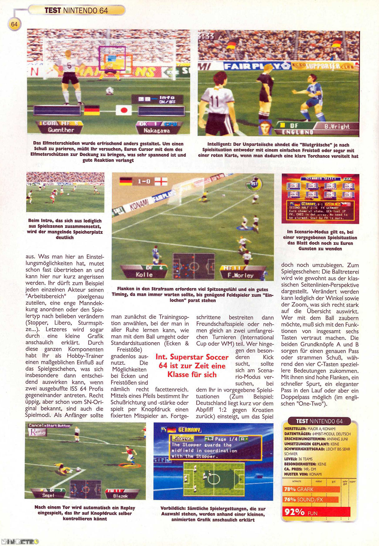 Hier kommt die wahrschenlichbeste Fußballaction, die je auf einer Konsole gesichtet wurde. 36 Nationalmannschaften mit wiedererkennbaren Stars. Fantastische Spielgraphik, mit über 18.000 unterschiedlichen Animationsphasen, die, dank Motion-Capture-Technik, nahezu jede erdenkliche Spielerbewegung zulassen. Gestalten Sie Ihre eigenen Spieler, nutzen Sie die praktisch unbegrenzte Vielfalt an taktischen und strategischen Optionen und lassen Sie sich vom authentischen Kommentar des Reporters mitreißen. International Superstar Soccer 64, die ultimative Fußballsimulation.