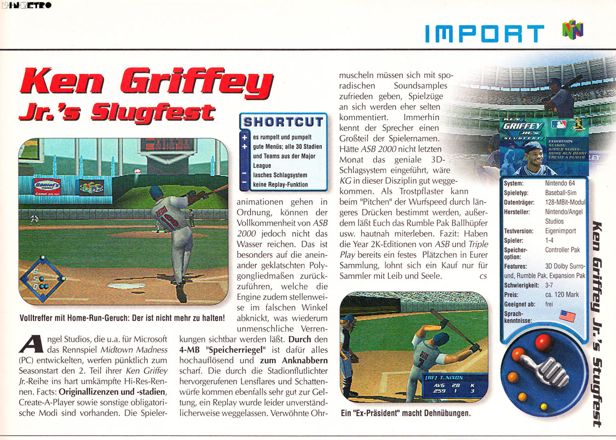 Bursting with stunning realism and high-excitement baseball action, Ken Griffey Jr.'s Slugfest drives home the winning run! Improved player animations and color commentary by Dave Niehaus - "The Voice of the Mariners" - make you feel like you're really at the game, while easy-to-use controls, updated rosters and statistics, and an optional fantasy draft make it even more fun than being there!