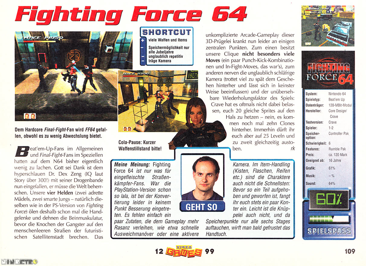 Fighting Force 64 delivers unparalleled action and tons of attack moves in a fully progressive 3D environment. Smash through an anti-tank barricade, pick up a rocket launcher and torch incoming enemies or knock over a vending machine or fuel tanker to find hidden weapons!