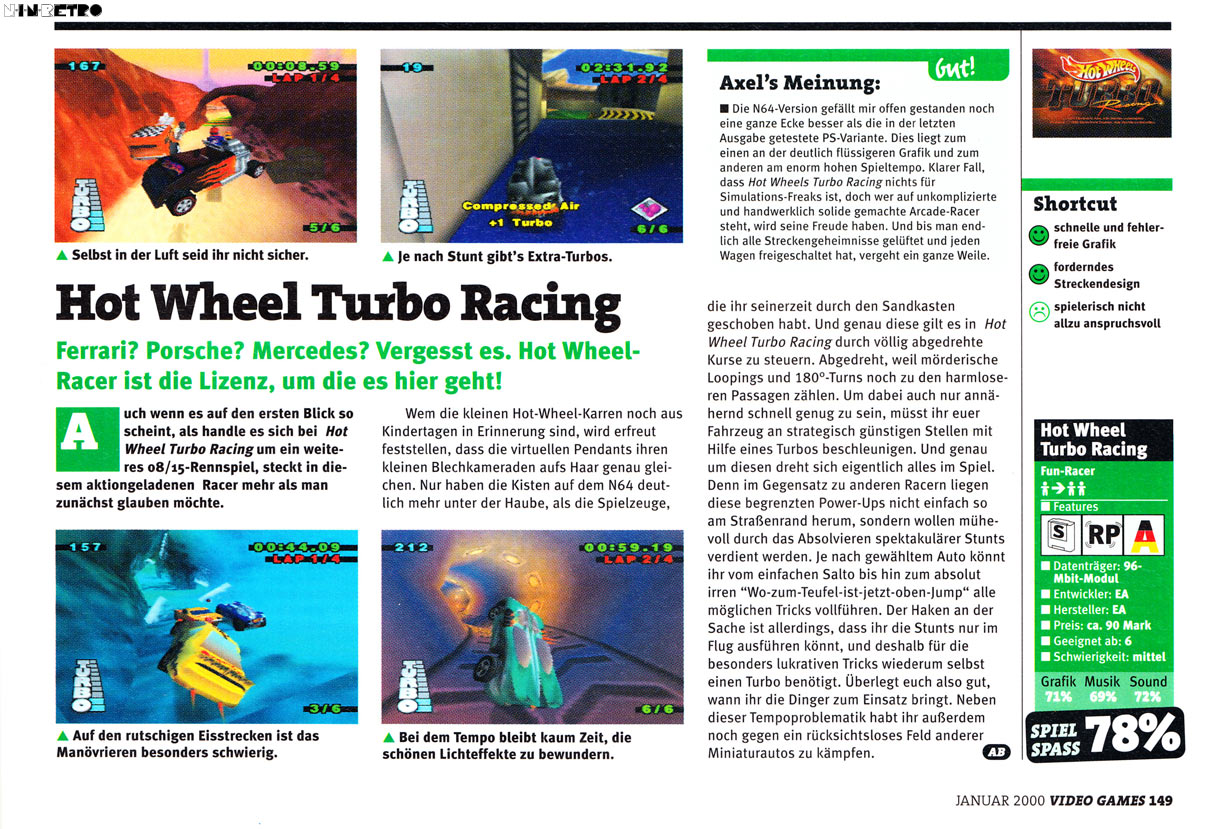 Ein unkomplizierter Arcade-Racer mit Potential. Das Spiel war wohl eher als Werbeträger für die hauseigenen Spielzeug-Produkte gedacht. Aber die Umsetzung ist ganz ordentlich. Die Steuerung ist in Ordnung, Grafik, Sound und Spielfluß ebenfalls. Ich kann gar nicht meckern. Es macht Spaß. Ganz solider Titel. Wer auf Micro-Machines und ähnliche Fun-Racer steht, wird mit den Hot Wheels wohl auch warm werden.