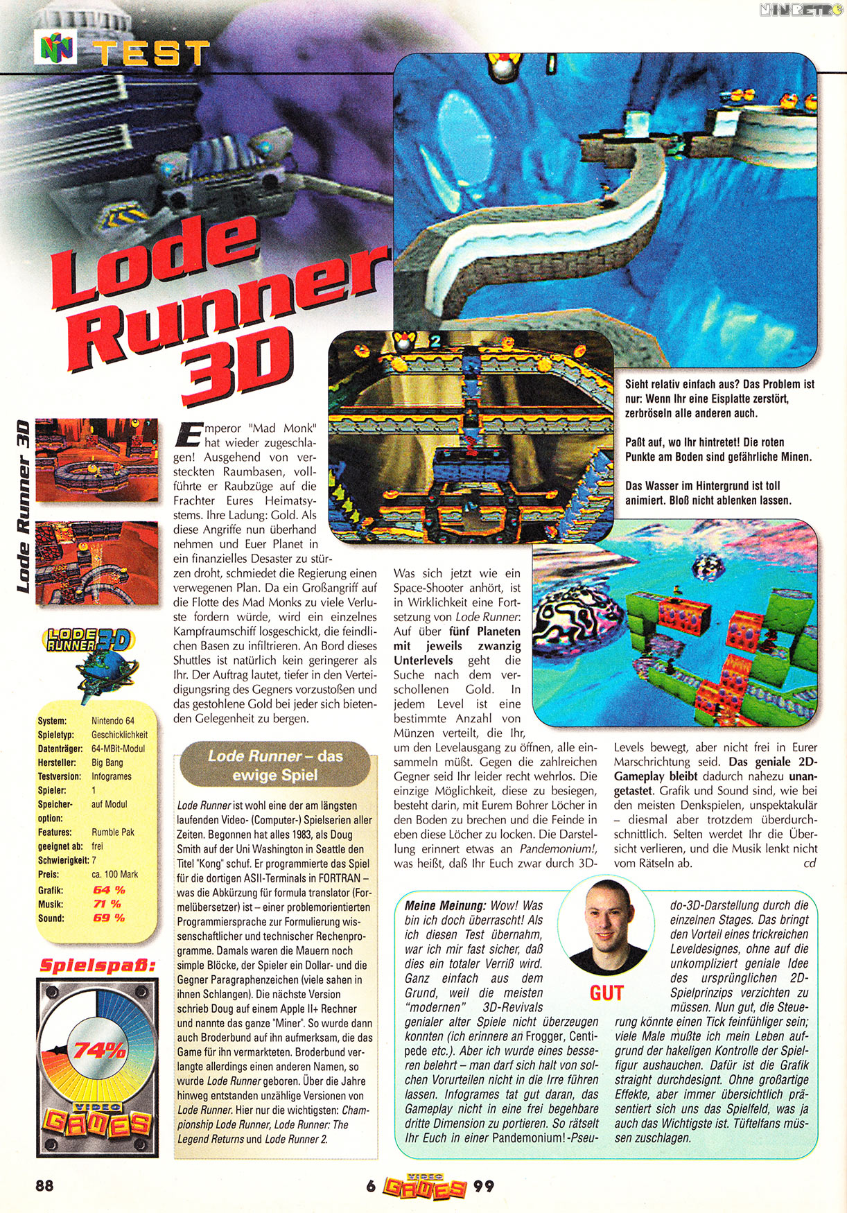 Wow, das war die letzten Tage eine ziemliche Überraschung für mich. Ich kann dem Daxter nur zustimmen, es ist echt ein tolles Puzzlespiel und ein echtes nicht so oft beachtetes Juwel auf dem N64. Es gibt durch die ganze Spielzeit immer wieder kreative Ideen und eigentlich hätte die VG es sogar ein bisschen besser bewerten können. Allerdings hat die Steuerung, wie der Test sagt, wirklich ab und an Aussetzer. Auf die begrenzten Leben hätte ich gerne verzichtet, zumal man das System mit dem Speichersystem eh beschummeln kann. Dazu sind die Ladebildschirme für ein N64-Spiel ungewohnt, zumal das hier echt nicht viel zu laden hat, nur ein paar Stege und Blöcke vor einem immerhin 360° Renderhintergrund. Und dann sind die letzten, vor allem das vorletzte Level, mit all den Gegnern mehr Glücksspiel als Puzzle. Tatsächlich habe ich das vorletzte Level erst geschafft, als sich die Feinde in einem Massen-KI-Aussetzer in einer Ecke gefangen haben, die ich schon abgegrast hatte.