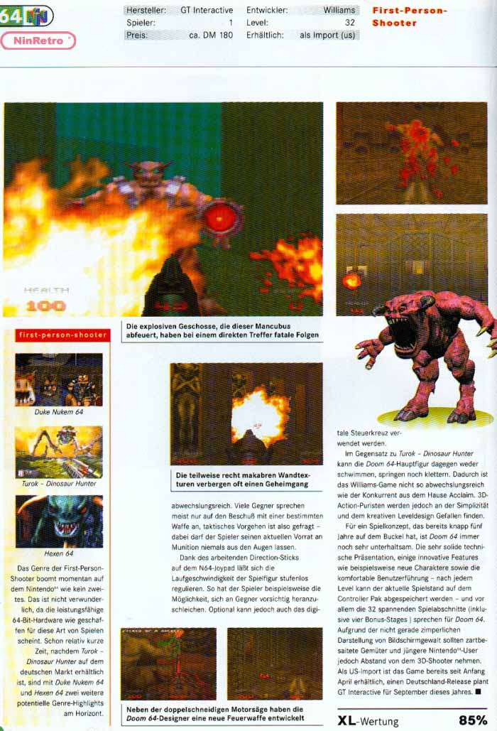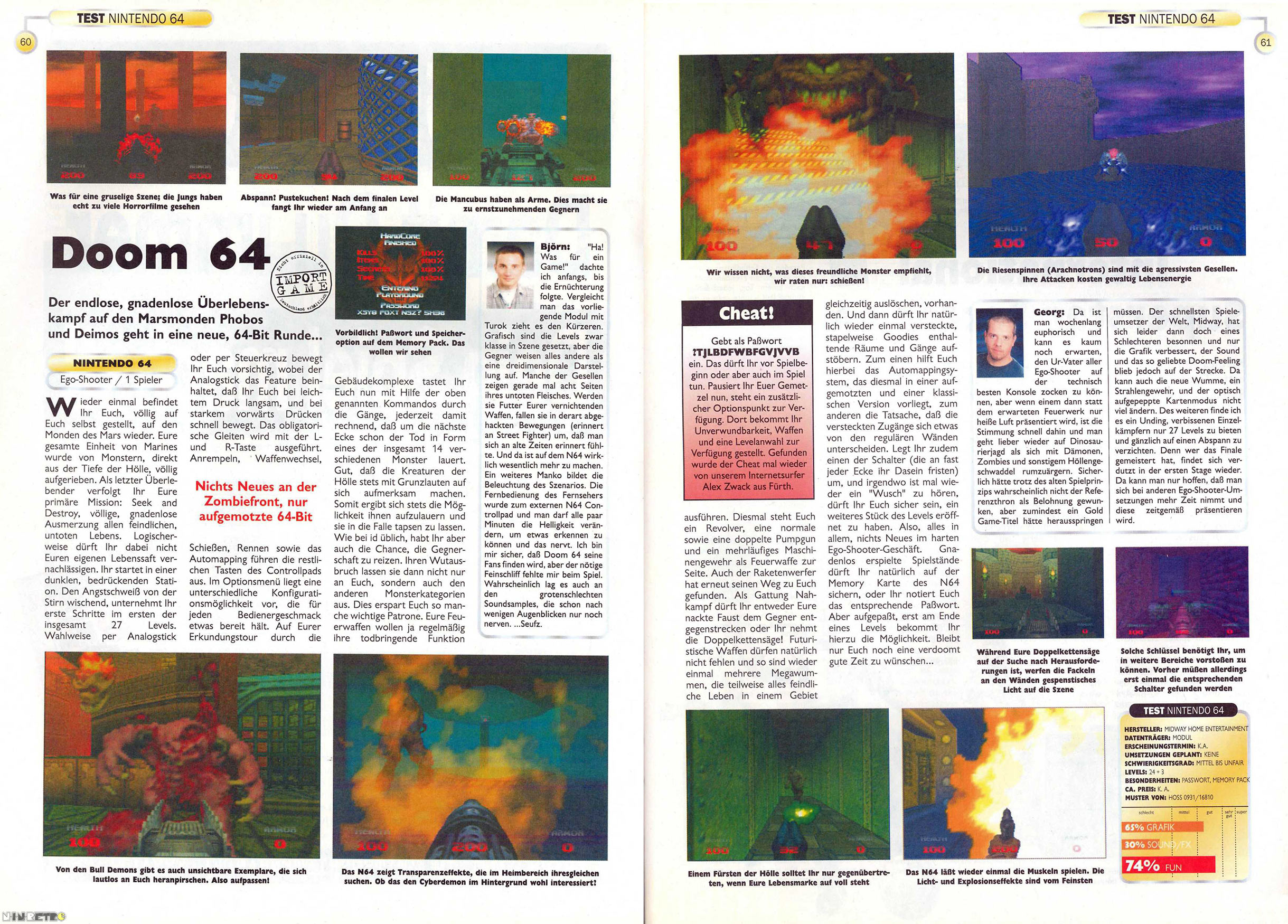 "Die allgemeinen Kritikpunkte an Doom 64 waren hingegen, dass es immer noch nicht möglich sei, zu springen, zu ducken oder auf und ab zu schauen. Außerdem gab es keinen Multiplayermodus im Spiel.,,