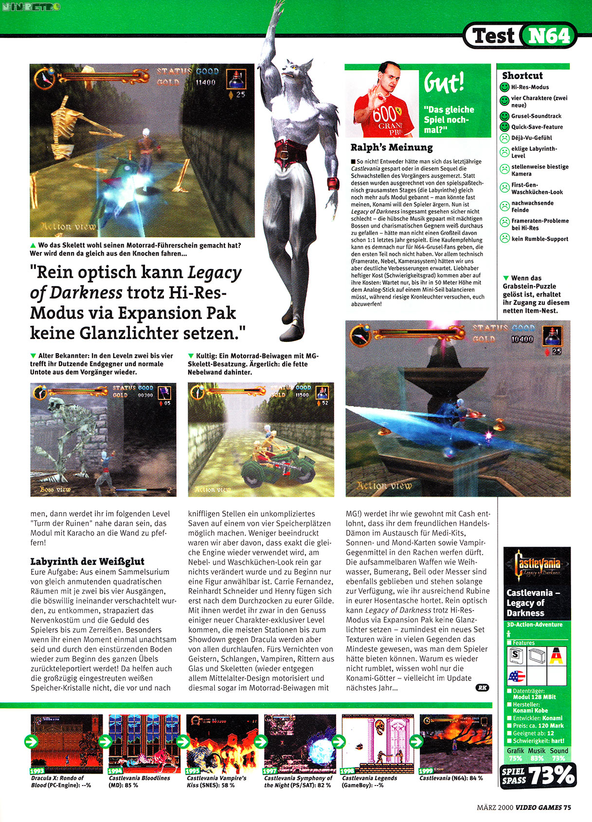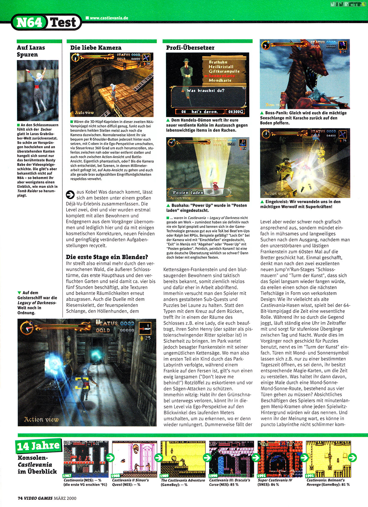 Die Wertung ist recht niedrig. Das Spiel ist zwar wirklich nur eine erweiterte Version des Vorgängers, hat aber bis auf kleine technische Mängel wirklich alles, was man sich von einem richtigen Castlevania wünscht. Und was die Video Games zum Labyrinth-Level schreibt ist lächerlich. Schaut man sich dort um, findet man eine Karte im Gestein, die einem den Weg zeigt und alle Orientierungsprobleme sind dahin. Einige der späteren Level sind so gut designt, dass ich bis heute kaum etwas Vergleichbares gesehen habe und auch die Mischung aus "Mittelalter und Moderne" passt und erzeugt eine geniale Atmosphäre. Nur das Herrenhaus kam mir irgenwie von einem anderen Spiel bekannt vor..