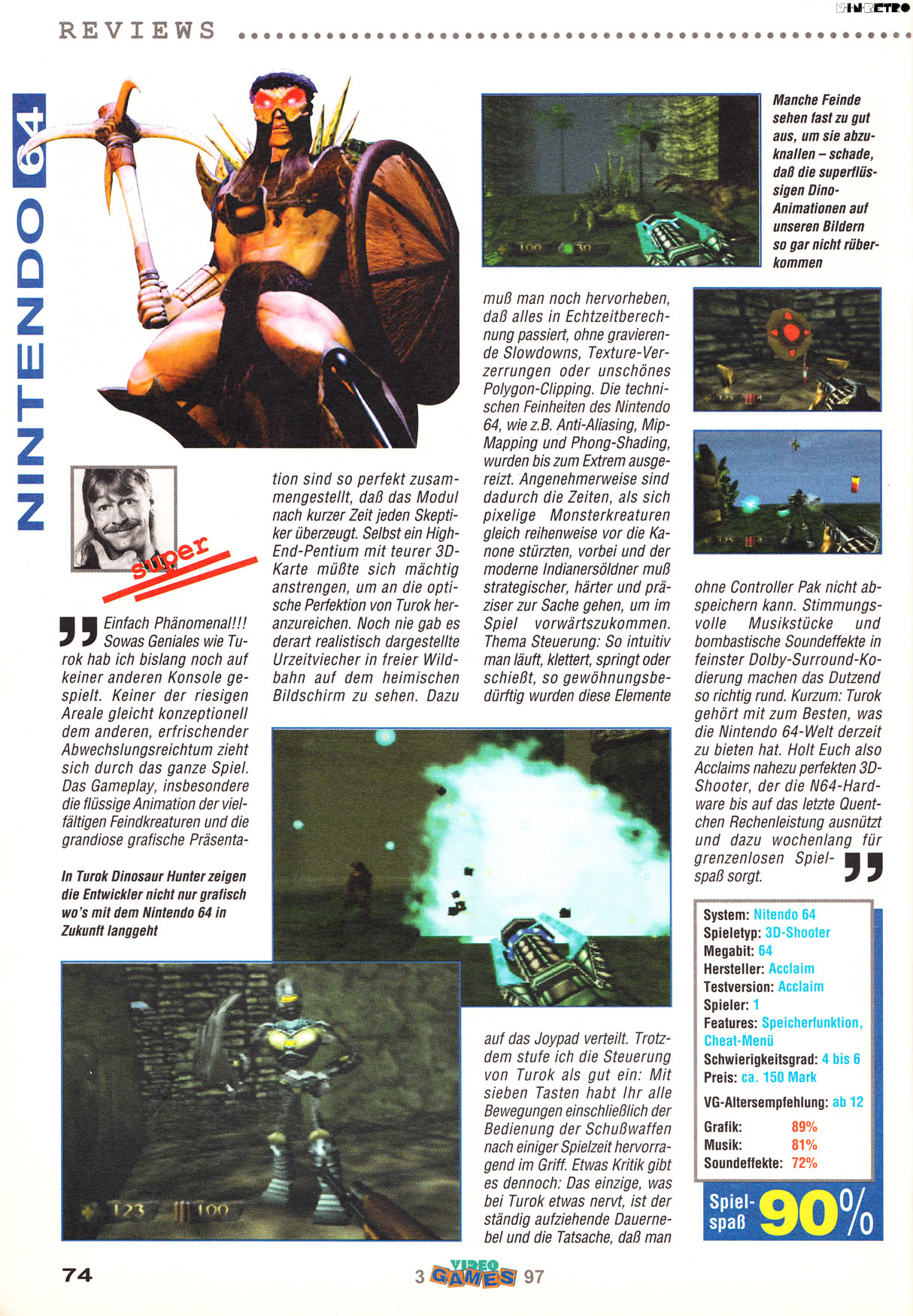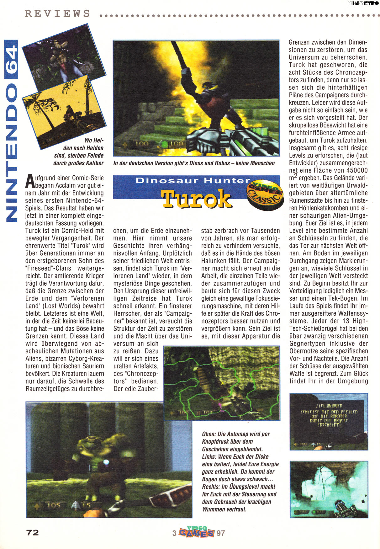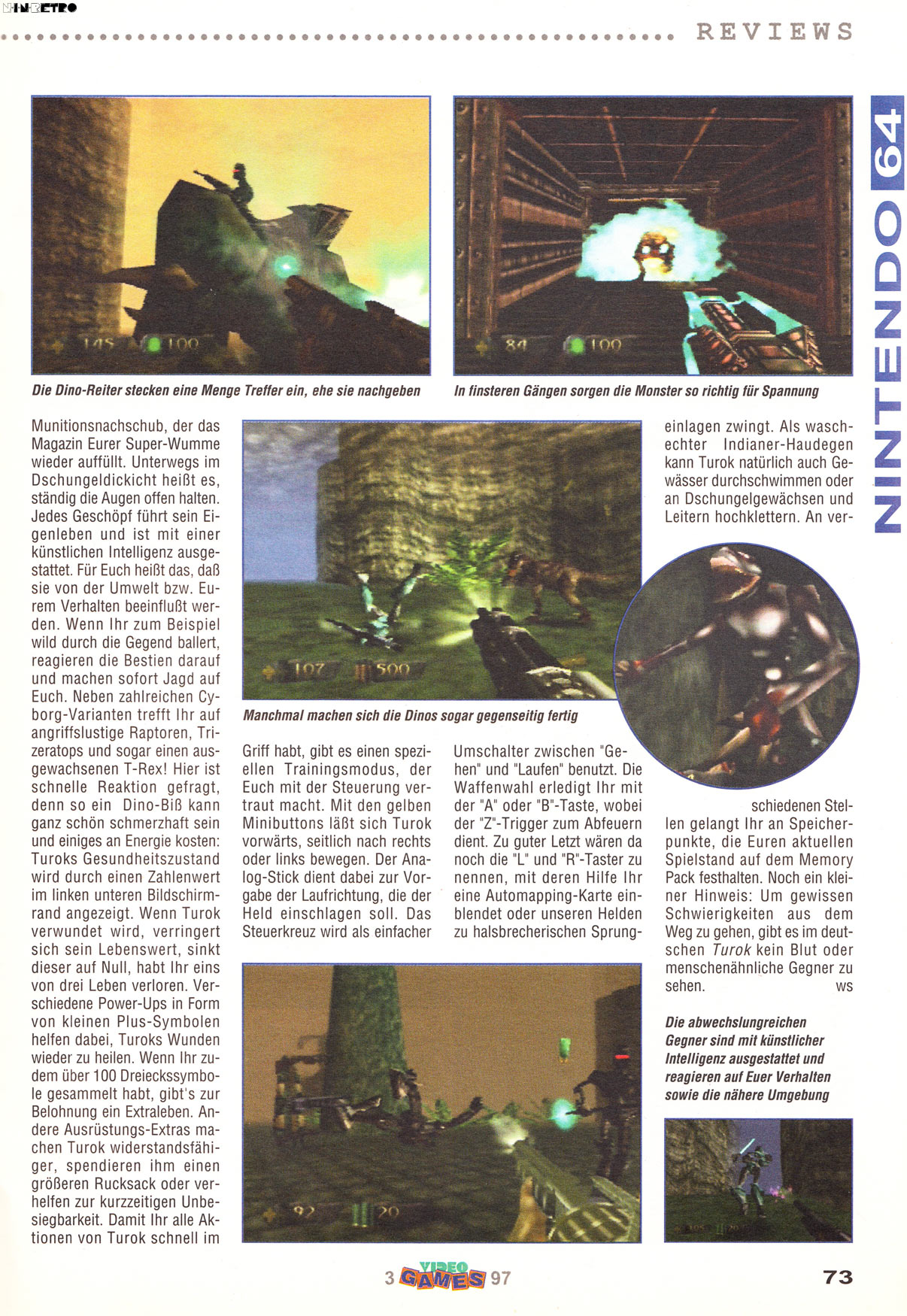 • "Revolutionäre 64-Bit-Grafik und phantastisches Gameplay: Turok - Dinosaur Hunter definiert den Begriff 3D-Action neu." - Total!