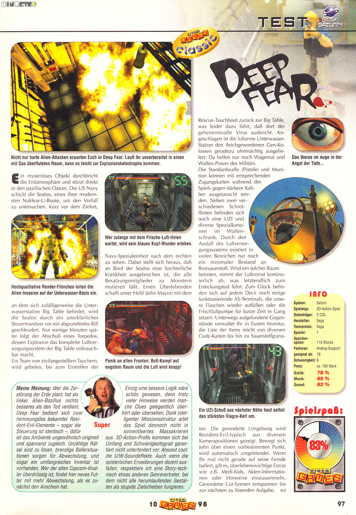 Zu Deep Fear ist schon sehr geil geworden und man merkt auch, dass viele Reviewer damals eine Scheu davor hatten, dem Titel noch groß Platz und Aufmerksamkeit zu geben. Was schade war, denn er zählt, meiner Meinung nach, zu den technisch schönsten und besten Saturn-Titeln (da spielt natürlich auch ein dickes Atmo-Bonus mit).
