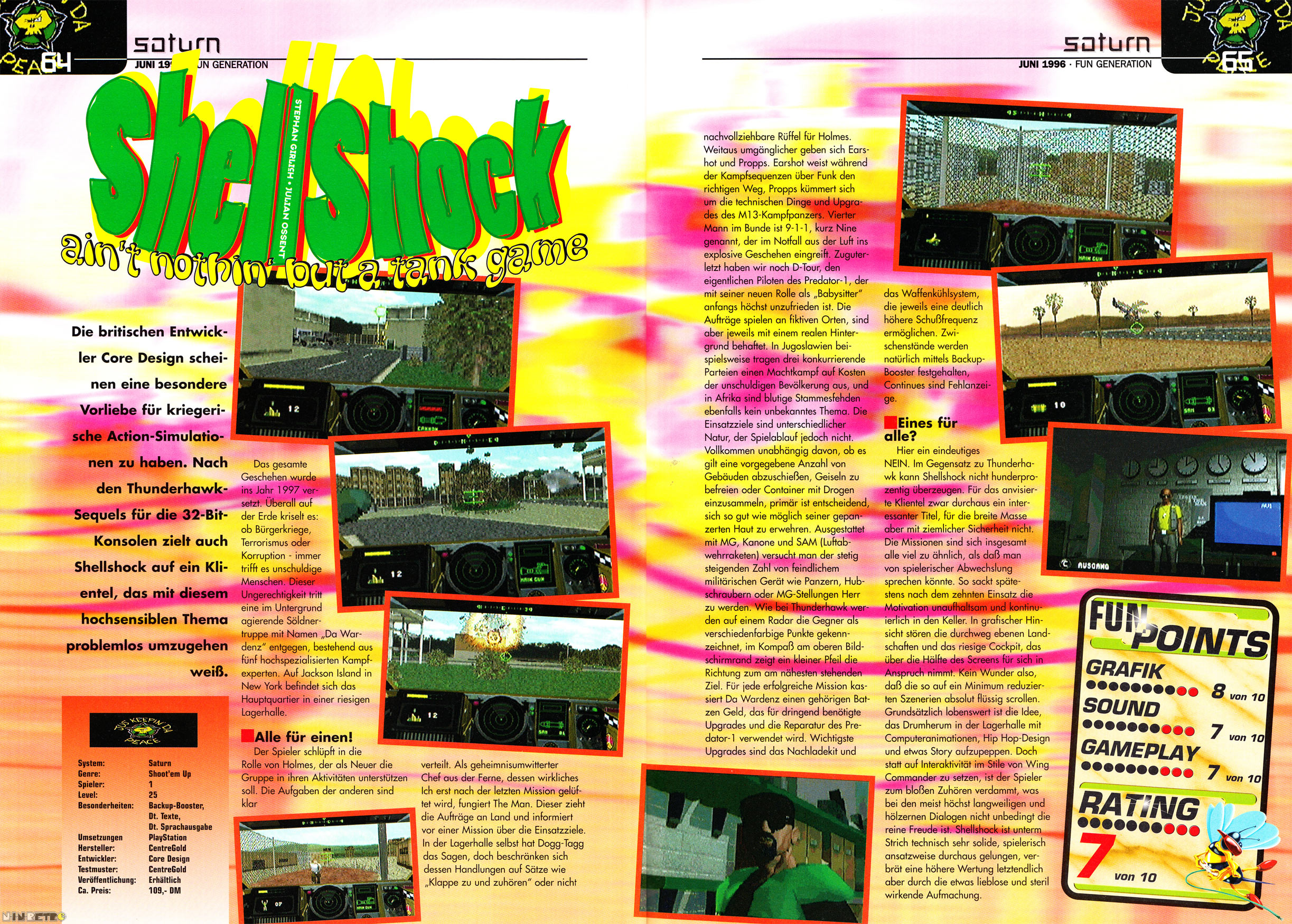 Nachdem ich auf dem Mega CD von Thunderhawk hellauf begeistert war und mich der 2. Teil auf dem Saturn sehr enttäuscht hat wurde ich hier dann mit Shellshock entschädigt. Das Spiel machte mir riesigen Spaß und es gibt nicht viele Saturn Spiele die ich so ausgiebig gespielt habe wie Shellshock. Ein großer Spaß.