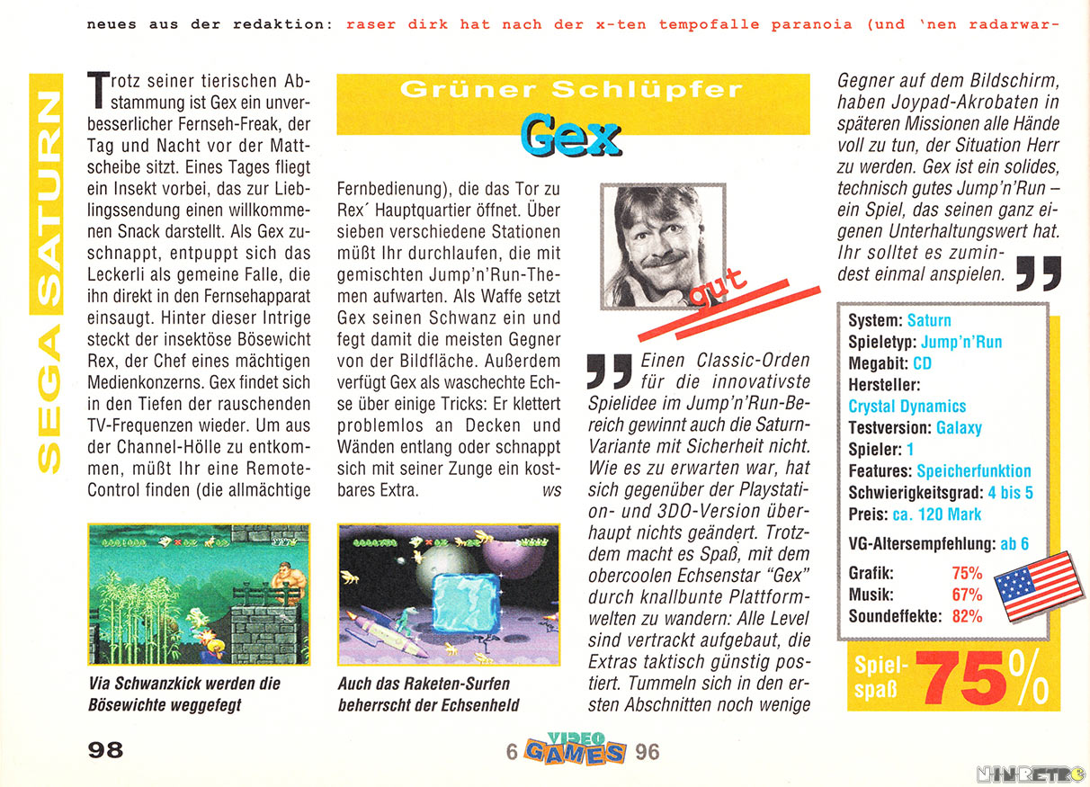 Gex muß mit Hilfe seines peitschenden Schwanzes und seiner Saugpfoten der Mediendimension entkommen! Über 450 Bilder mit 3D-Animation und manuell gestaltetem Hintergrund!