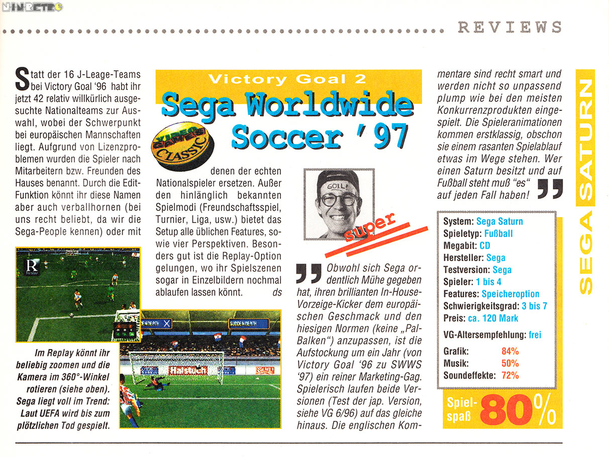 Hätte man ein SWWS mit der Lizenz von FIFA und den ganzen EA-Sports Drumherums entwickelt, wäre es ein perfektes Game für den Saturn. So muss man sich für ein Spiel entscheiden, je nachdem was man für Vorlieben hat.