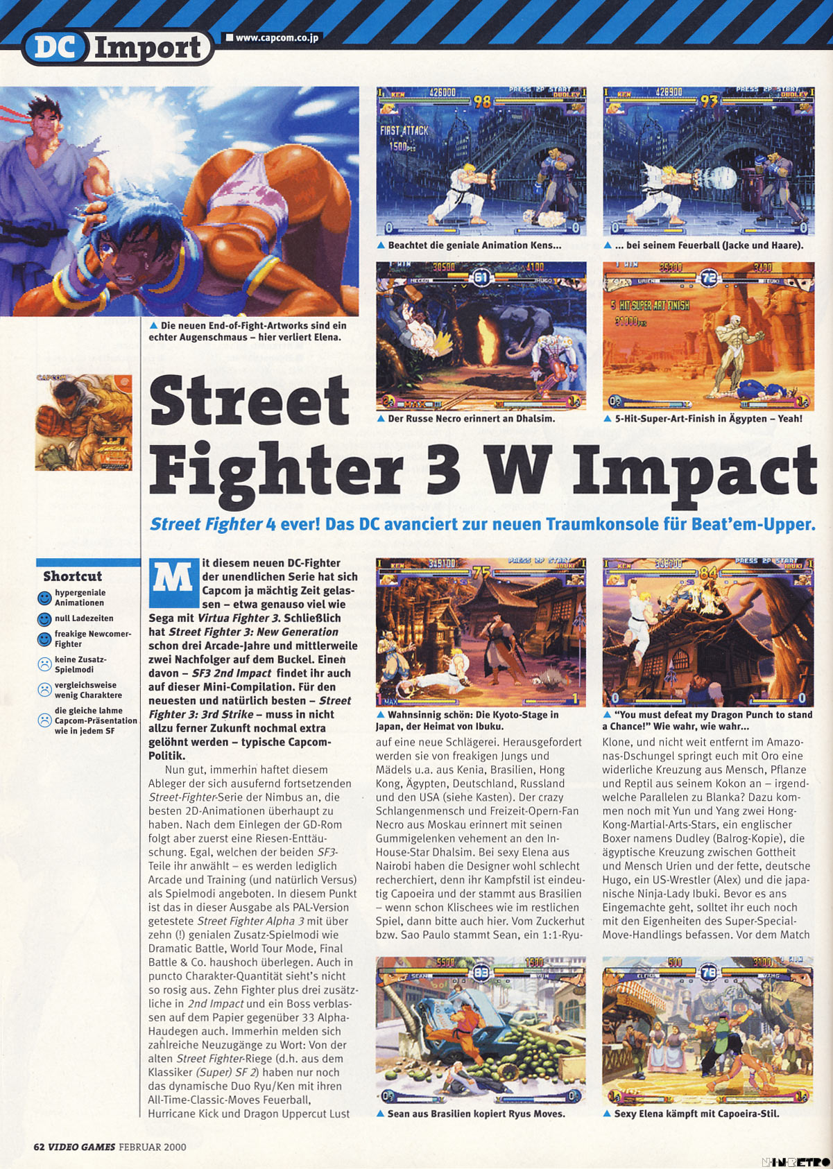 Street Fighter III: New Generation... and Street Fighter III: 2nd Impact. Loaded with a new legion of fighters, Street fighter III: Double Impact boasts new enhancements to the series like parrying, Super Art fighting styles and two-punch, two-kick combos to inflict more damage.