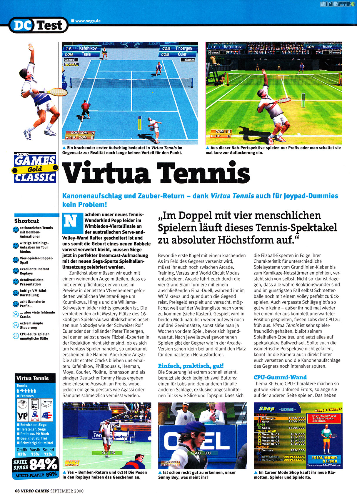 Stellen Sie sich vor, wie sich ein Tennisspieler fühlt, wenn er den Platz betritt. Die Menge jubelt, die Atmosphäre ist wie elektrisiert, der Adrenalinpegel steigt... Mit Virtua Tennis können Sie das selbst erleben, im lebensechtesten und einsteigerfreundlichsten Tennis-Spiel, das es je gab! Gehen Sie als einer von acht lizenzierten Spielern auf den Platz und entdecken Sie die geheimen Stars. Es gibt den traditionellen Arcade-Modus, den Exhibition-Modus und Vier-Spieler-Action im Doppel. Und wenn Sie diese Modi beherrschen, können Sie im World Circuit-Modus die ganze Welt herausfordern. Zusätzlich gibt's noch einzigartige Trainingsspiele, verschiedene Wettbewerbe und Shops, in denen Sie Kleidung, Ausrüstung, Spielstätten und Tennispartner einkaufen können. Virtua Tennis ist so realistisch - holen Sie sich keinen Tennisarm!