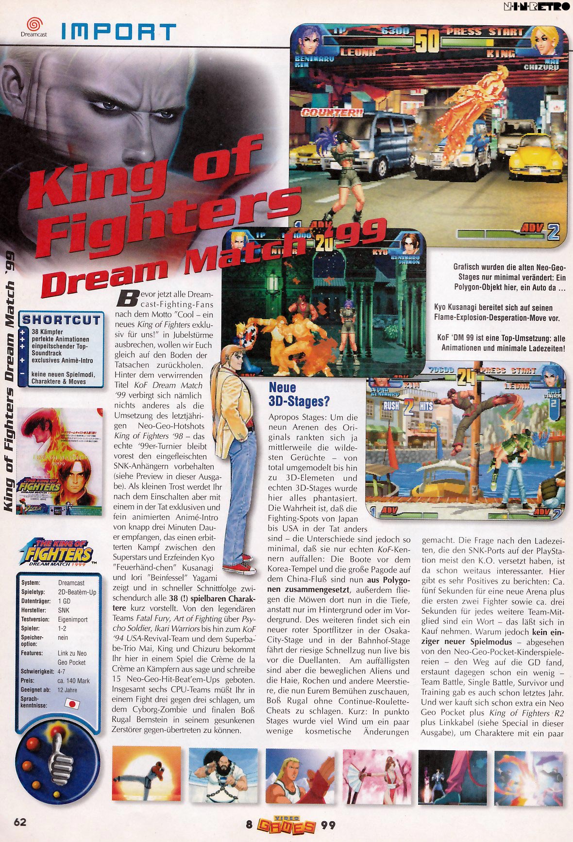 SNK's monumental first game for the Sega Dreamcast is a complete adaptation - with added surprises - of the "KOF" series, the ultra-popular action fight fest! It's name: "The King of Fighters: Dream Match 1999". Along with Kyo Kusanagi and Iori Yagami, you'll find 38 SNK all-stars letting the sparks fly in exciting worlds made possible only with the Sega Dreamcast!!!